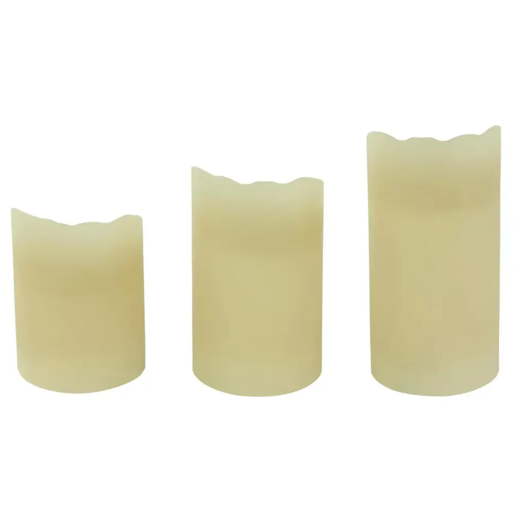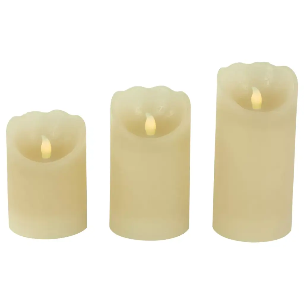 This flameless LED pillar candle with a moving flame will add an elegant touch to your decorations. This candle is made with real wax and the flames lightly flicker for the look and feel of a traditional candle. This classic design will be the perfect addition to bookshelves, mantles, holiday centerpieces, or everyday decor. Product Features: flameless pillar candle set Candles are made of real wax for a realistic look and feel Convenient on/off switch at the bottom Candles each requires 2 "AA" batteries (not included) Recommended for indoor use only Dimensions: Large candle: 6" high x 3" diameter Medium candle: 5" high x 3" diameter Small candle: 4" high x 3" diameter Material(s): wax/plastic NoteSet includes 1 of each item shown