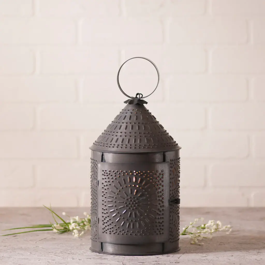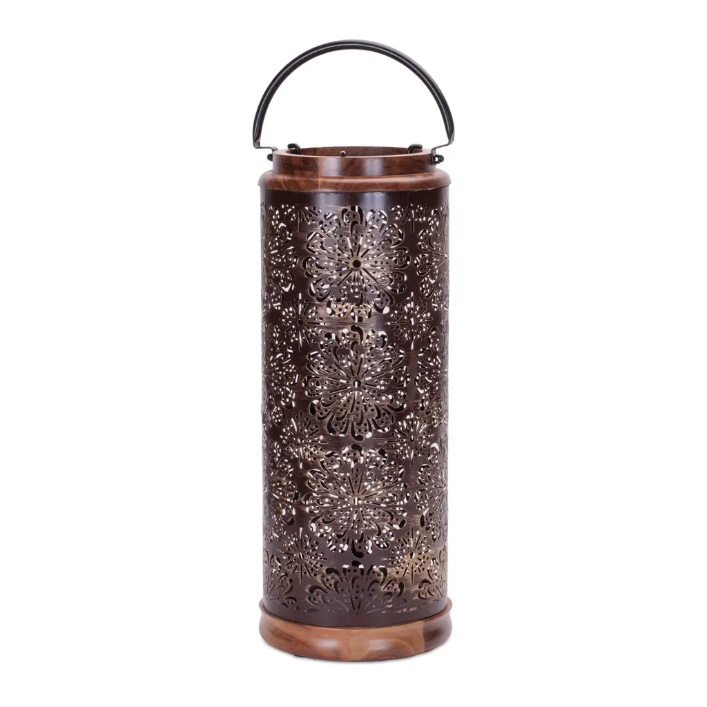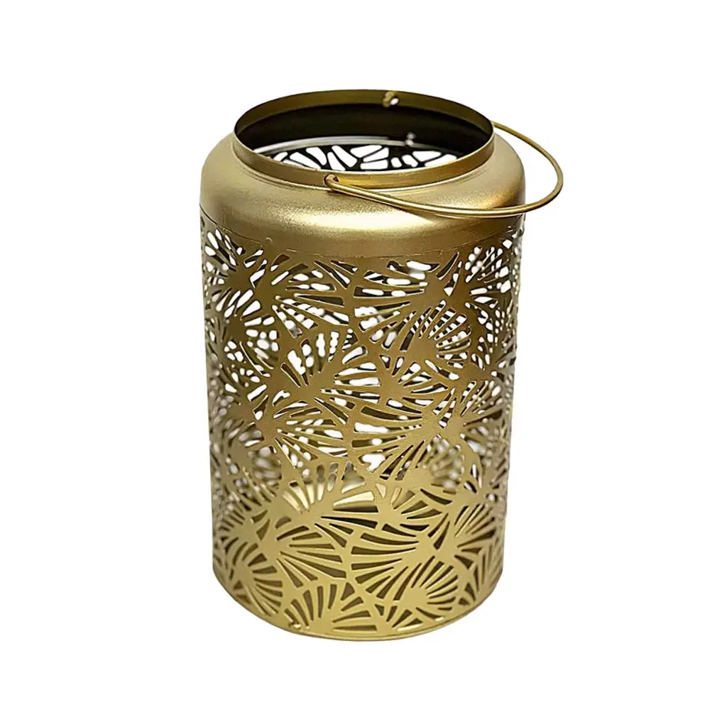 These black and gold laser-cut metal lanterns blend traditional pierced metal styling with modern design. Intricate pinpoint patterns cast delicate shadows through three candle lanterns in graduated 12”, 9” and 6” heights. The cylindrical black metal lanterns are crafted with geometric designs and the gold painted interior provides an elegant and softly reflective finish. Using your own pillar candles or flameless candles, place them on a tabletop or hang them from the attached hooks to stylishly light your home. Product Features: Middle Eastern style candle lanterns feature floral cut-out designs Uniquely finished with matte black on the outside and a contrasting rich gold inside Each holds (1) pillar candle - not included Recommended for indoor use Dimensions: Large: 12" high x 5" diameter Medium: 9" high x 4.5" diameter Small: 6" high x 3.5" diameter Material(s): metal