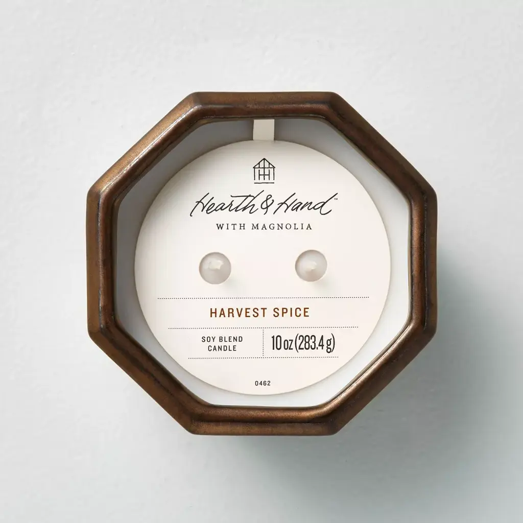 Fill your home with sweet and spicy fall aromas with this Harvest Spice Soy Blend Candle from Hearth & Hand™ with Magnolia. Infused with pleasant cinnamon, nutmeg and other spice scents intermingled with citrus and floral notes, this scented jar candle brings the soothing fragrances of fall to your abode. Poured in an octagonal ceramic jar in a metallic bronze hue, this candle makes a stunning decorative accent piece for your mantel, coffee table or foyer table. Hearth & Hand™ with Magnolia: Gather • Create • Enjoy