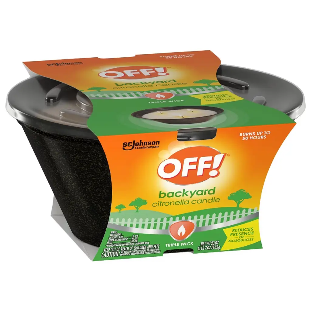 OFF! Citronella Candle Bucket gives all your outdoor occasions the ambiance and gentle glow they deserve. This 3-wick scented oil candle can be re-lit for continuous use and burns for up to 50 hours, reducing the presence of mosquitoes. These mosquito candles are perfect for pre-back yard, pre-hosting and pre-relaxing. This OFF! Triple Wick Citronella Candle works just like a normal candle and makes the perfect centerpiece. Add this decorative outdoor candle to your space to create an inviting atmosphere. Use outside on your tabletop, deck or patio. See the label for precautions and usage directions.