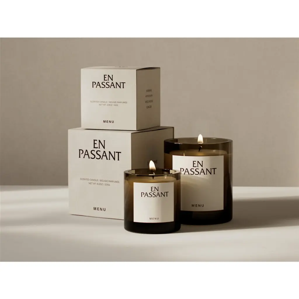 Audo Copenhagen's Olfacte scented candles will create a magnificent atmosphere in your home. Choose the matching fragrance for the moment, light the candle and enjoy with all your senses! Burning in their glass jar, paraben-free and phthalate-free Olfacte scented candles are made in the USA from responsibly sourced natural essential oils and plant-based wax. When the candle has burned out, you can clean the glass jar and reuse it as a decoration or storage jar. Olfacte scented candles are also a great gift idea for your loved ones. Olfacte's En Passant scented candle has notes of grapefruit, eucalyptus, ginger, jasmine, lavender and hyacinth. The fresh floral fragrance is completed with notes of wild moss, geranium and cedar wood.