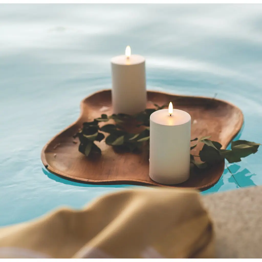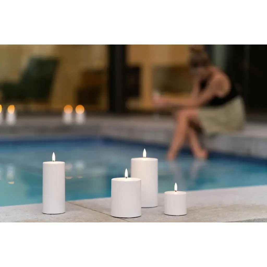 Uyuni Lighting's Outdoor LED pillar candle is a safe way to create a warm and inviting atmosphere in outdoor spaces – the kind that can only be achieved with the gentle flicker of a burning candle. The water-resistant and UV-protected Outdoor LED candle is equipped with Uyuni’s patented 3D flame that mimics the fluttering of a regular candle, glowing softly in a warm white tone. The battery-operated LED candles do not heat up during use and do not need to be monitored like regular candles, making them ideal for families with children or pets. Flameless LED candles are also great for centerpieces and other compositions as they do not pose a fire hazard even when in contact with other decorations. The Uyuni Outdoor LED pillar candle has a built-in timer with which you can set the candle to burn for six hours. With the Uyuni remote control, available separately, the timer can be set for either 4, 6, 8 or 10 hours. With the remote control, the candle is also dimmable.