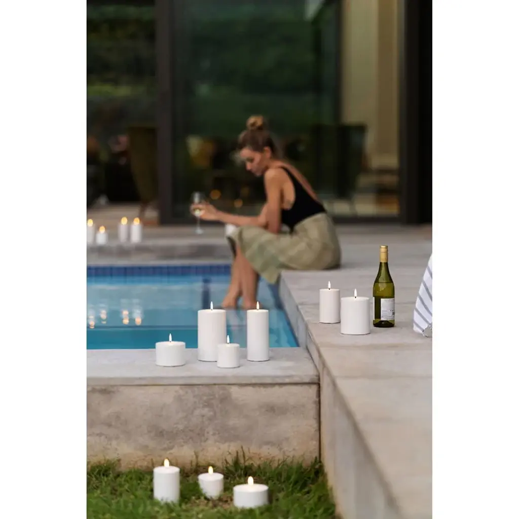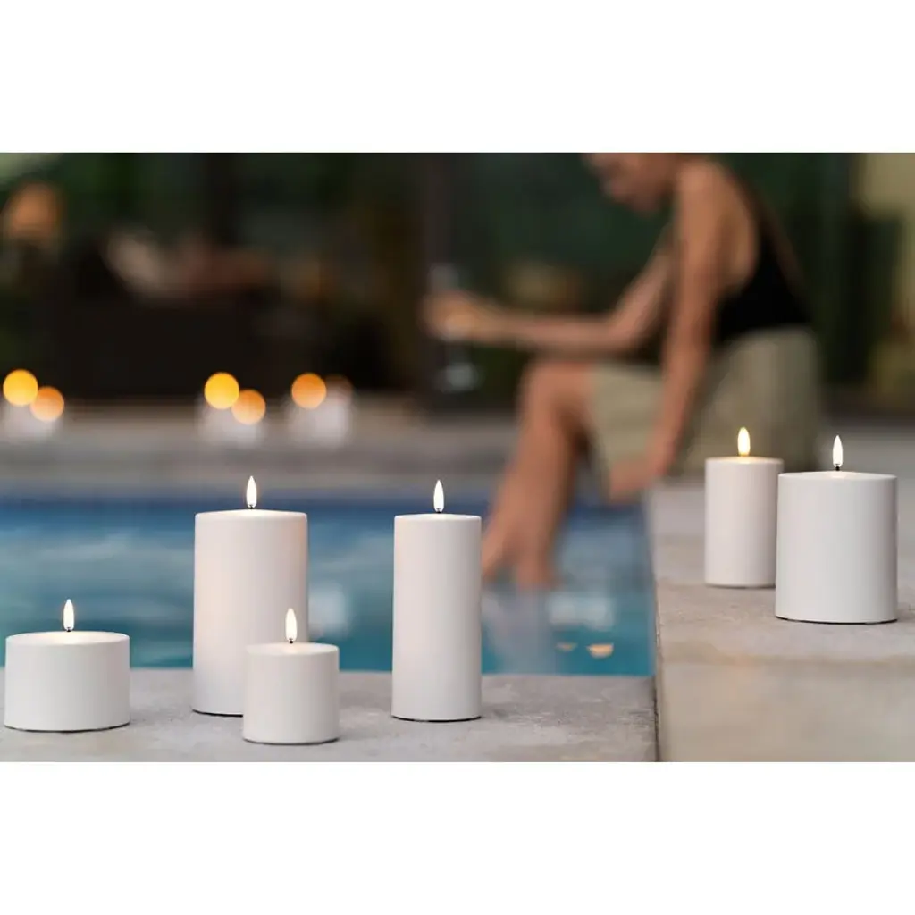 Uyuni Lighting's Outdoor LED pillar candle is a safe way to create a warm and inviting atmosphere in outdoor spaces – the kind that can only be achieved with the gentle flicker of a burning candle. The water-resistant and UV-protected Outdoor LED candle is equipped with Uyuni’s patented 3D flame that mimics the fluttering of a regular candle, glowing softly in a warm white tone. The battery-operated LED candles do not heat up during use and do not need to be monitored like regular candles, making them ideal for families with children or pets. Flameless LED candles are also great for centerpieces and other compositions as they do not pose a fire hazard even when in contact with other decorations. The Uyuni Outdoor LED pillar candle has a built-in timer with which you can set the candle to burn for six hours. With the Uyuni remote control, available separately, the timer can be set for either 4, 6, 8 or 10 hours. With the remote control, the candle is also dimmable.