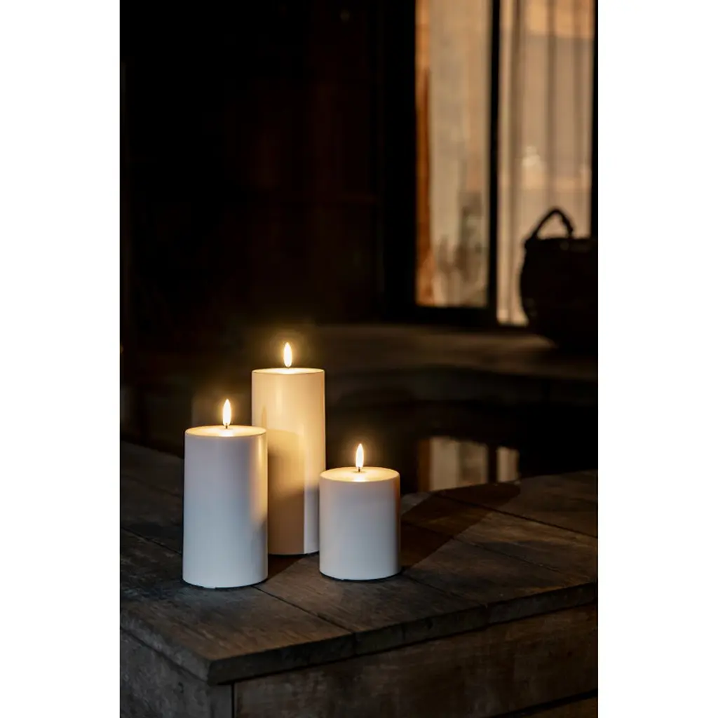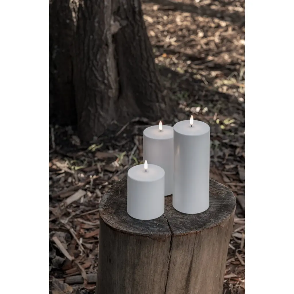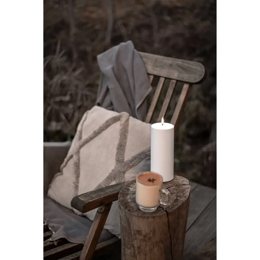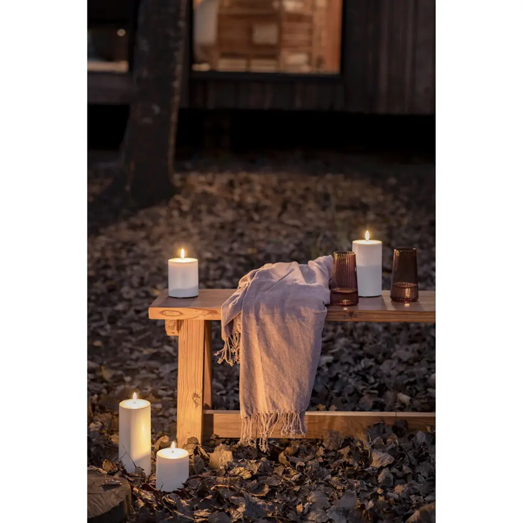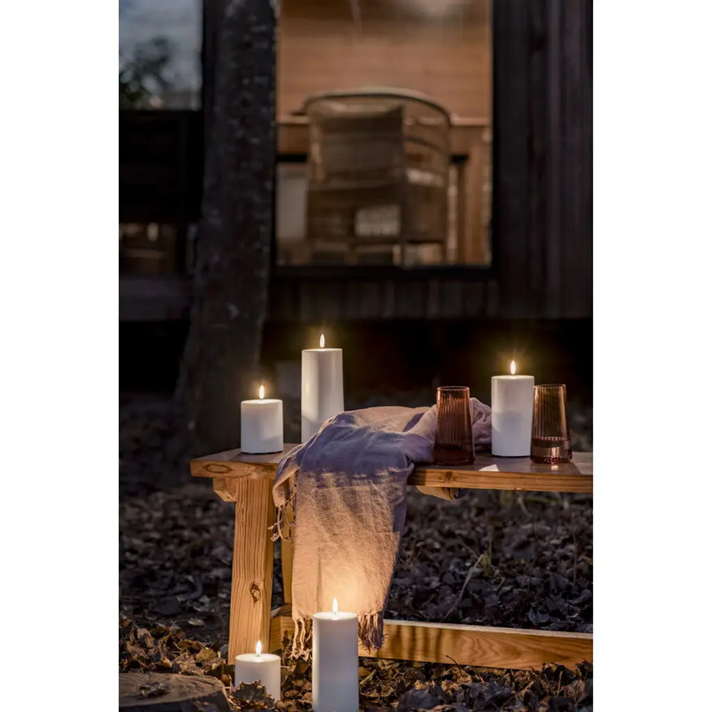 Uyuni Lighting's Outdoor LED pillar candle is a safe way to create a warm and inviting atmosphere in outdoor spaces – the kind that can only be achieved with the gentle flicker of a burning candle. The water-resistant and UV-protected Outdoor LED candle is equipped with Uyuni’s patented 3D flame that mimics the fluttering of a regular candle, glowing softly in a warm white tone. The battery-operated LED candles do not heat up during use and do not need to be monitored like regular candles, making them ideal for families with children or pets. Flameless LED candles are also great for centerpieces and other compositions as they do not pose a fire hazard even when in contact with other decorations. The Uyuni Outdoor LED pillar candle has a built-in timer with which you can set the candle to burn for six hours. With the Uyuni remote control, available separately, the timer can be set for either 4, 6, 8 or 10 hours. With the remote control, the candle is also dimmable.