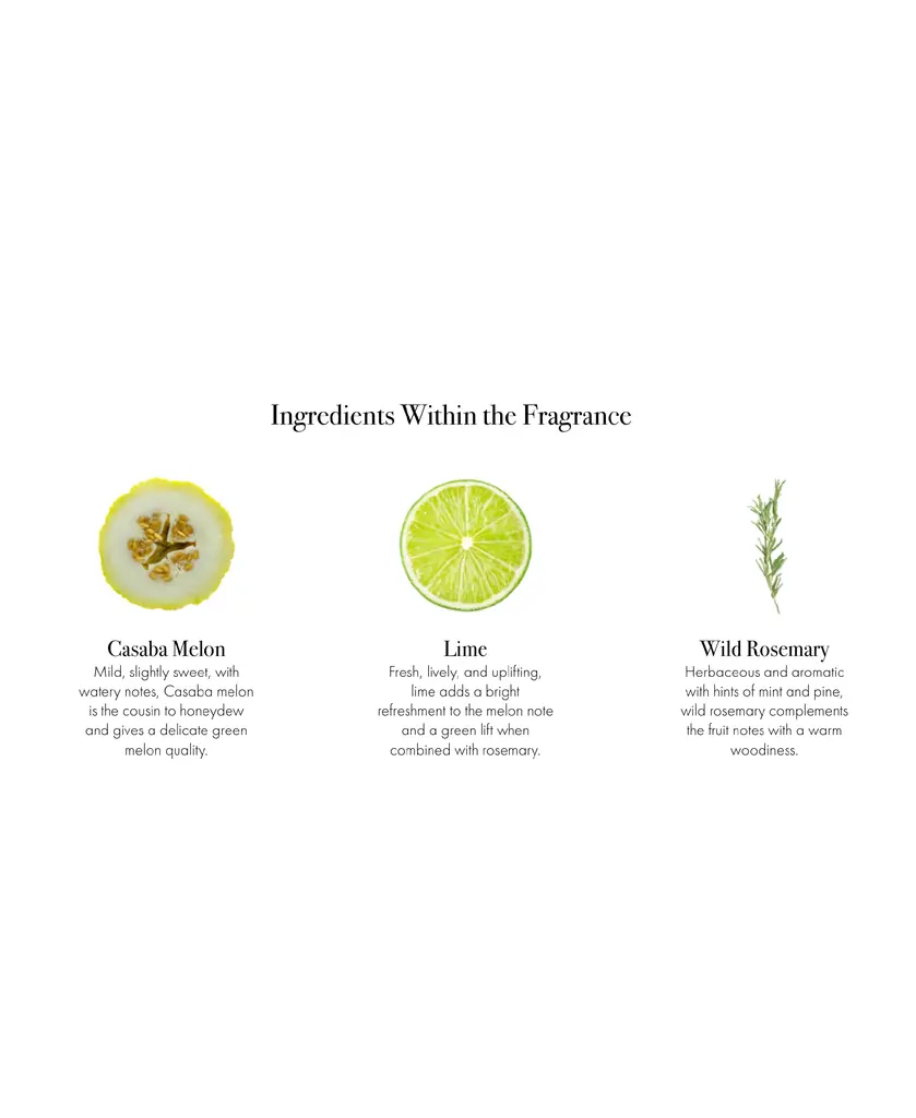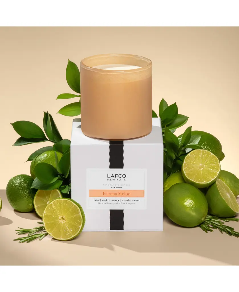 From LAFCO's House and Home Collection, Paloma Melon fills your space with a kaleidoscope of fragrance. A warm summer breeze carries the herbaceous, minty scent of wild rosemary through open windows, meeting the fresh, fruity aromas of sweet casaba melon, juicy cantaloupe and tangy lime to help you relax and unwind.