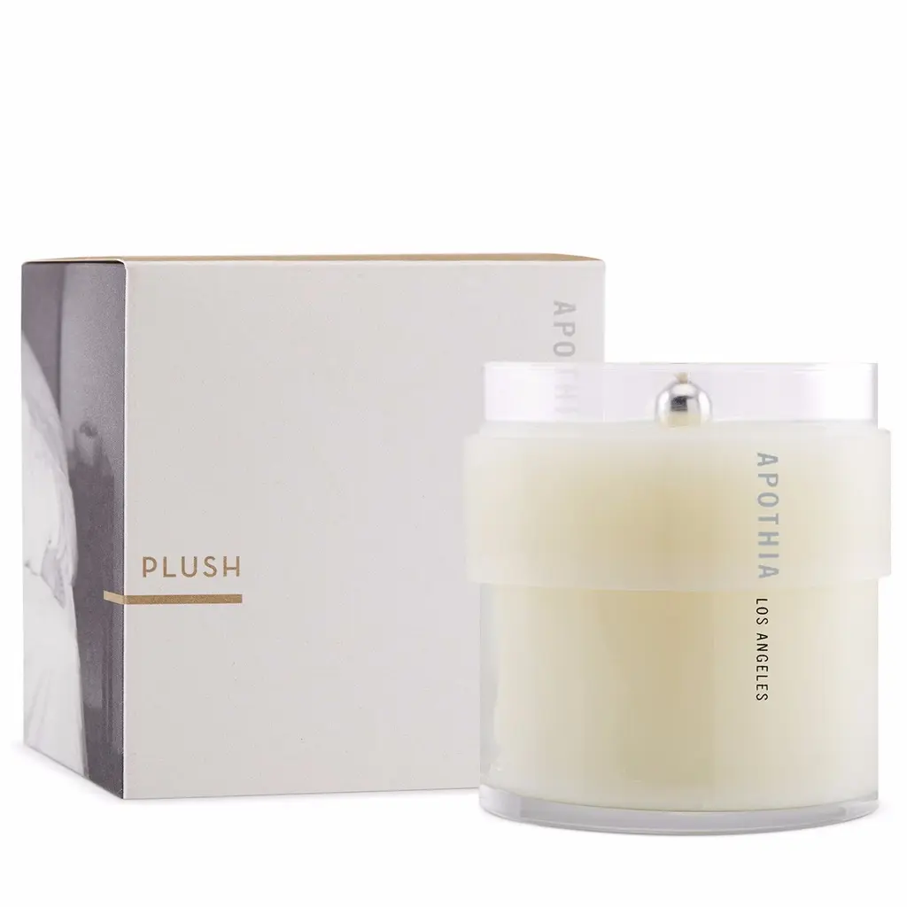 Full service, crisp linens, deep baths,secret gardens, sleeping in. Do not disturb. FRAGRANCE NOTES: Plush is the scent of luxury, French-milled soap and petitgrain with bright citrus notes of mandarin, lime and pomelo. APOTHIA’s illuminating cream candles are developed from a unique combination of premium paraffin and soy, blended with intense fragrance into a creamy luxurious balm of solid perfume – rub it into your skin! Named Interior Fragrance of the Year, APOTHIA’s award-winning candles take the senses into visions of life at its best.DETAILS: The Silver Bead creates interest, sparks conversation and reminds you when to trim the wick! APOTHIA’s patented Halo allows you to move a burning hot candle without feeling the heat! It won’t slip out of your fingers, and emits a gorgeous, “halo-like” effect. Size: 250 g/9 oz 60 Hour Burn Time If showing QuickShip, this item ships within 1-2 business days. Otherwise, please allow 1-2 weeks to ship out and receive tracking.