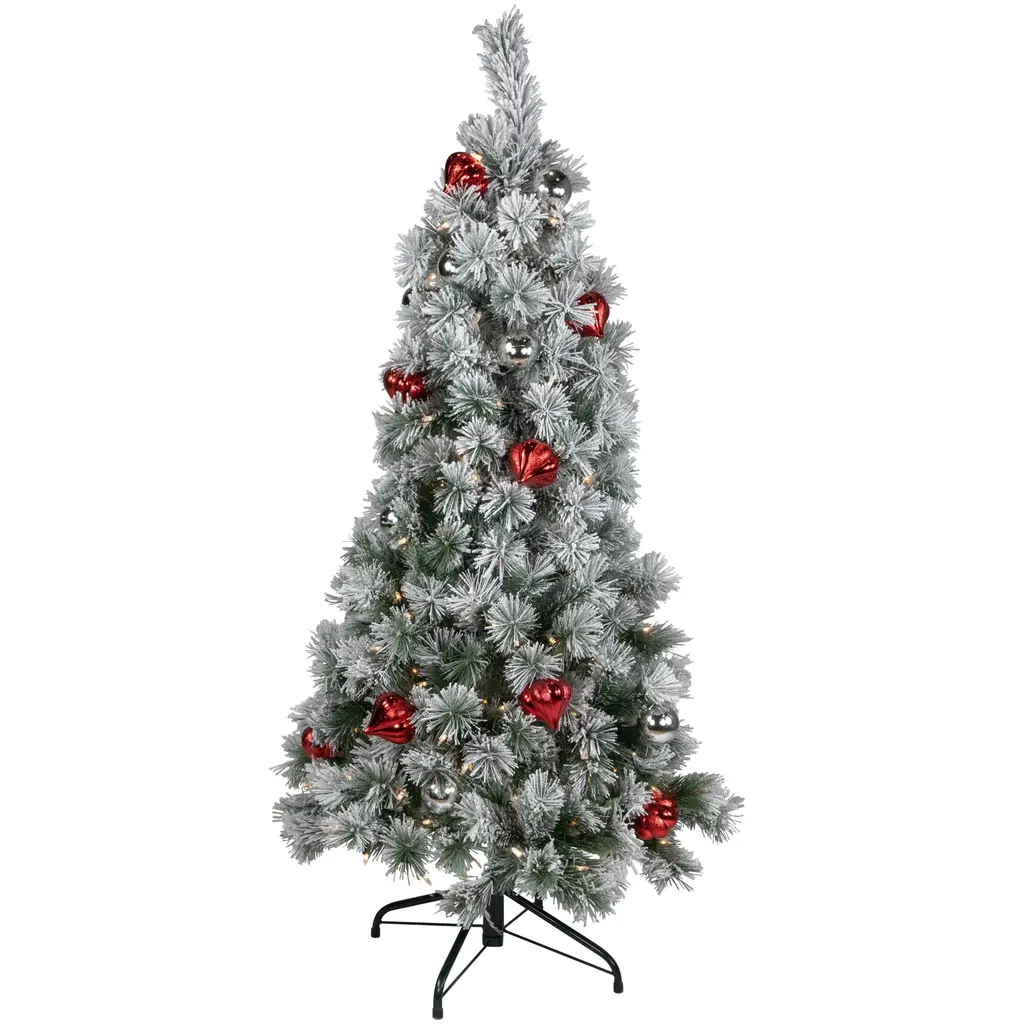 This marvelous Bristol pine tree will create a magical winter wonderland in your home with its snowy heavily flocked branches that are very life-like. The addition of warm white LED lights brings a warm and inviting glow not only to the tree itself but also to your entire home decor illuminating the holiday spirit. Decorated with red onion and silver ball ornaments for your convenience while also adding pops of color. Spend less time with installation as it has a hinged branch system that allows the branches to swing down for a quick and simple set-up and also folds up easily for storage until the next year's festivities. Product Features: Pre-lit with 400 warm white LED lights "Warm white" also known as "warm clear" has a soft natural incandescent glow similar to candlelight Bulb size: mini Bulb type: LED 940 tips 63" green lead cord Additional Product Features: LED lights use 90% less energy Bulbs stay cool to the touch Slim profile tree Hinged branch construction Decorated with red onion and silver ball ornaments Light sets on the tree are UL certified and approved for indoor or outdoor use however the tree itself is recommended for indoor use only If one bulb burns out the rest will stay lit 4-piece easy assembly (including stand) Comes with replacement bulbs and spare fuses Comes with a FREE green metal tree stand Dimensions: 7' high (from the base of the stand to the top of the tree) 44" base diameter (at the widest point) Stand: 7.25" high x 22.25" wide Material(s): PVC/metal/glass bulbs/wire Note: Hinged branches are compressed for shipment and need to be fluffed out upon arrival to look like the photo