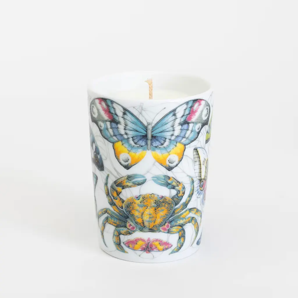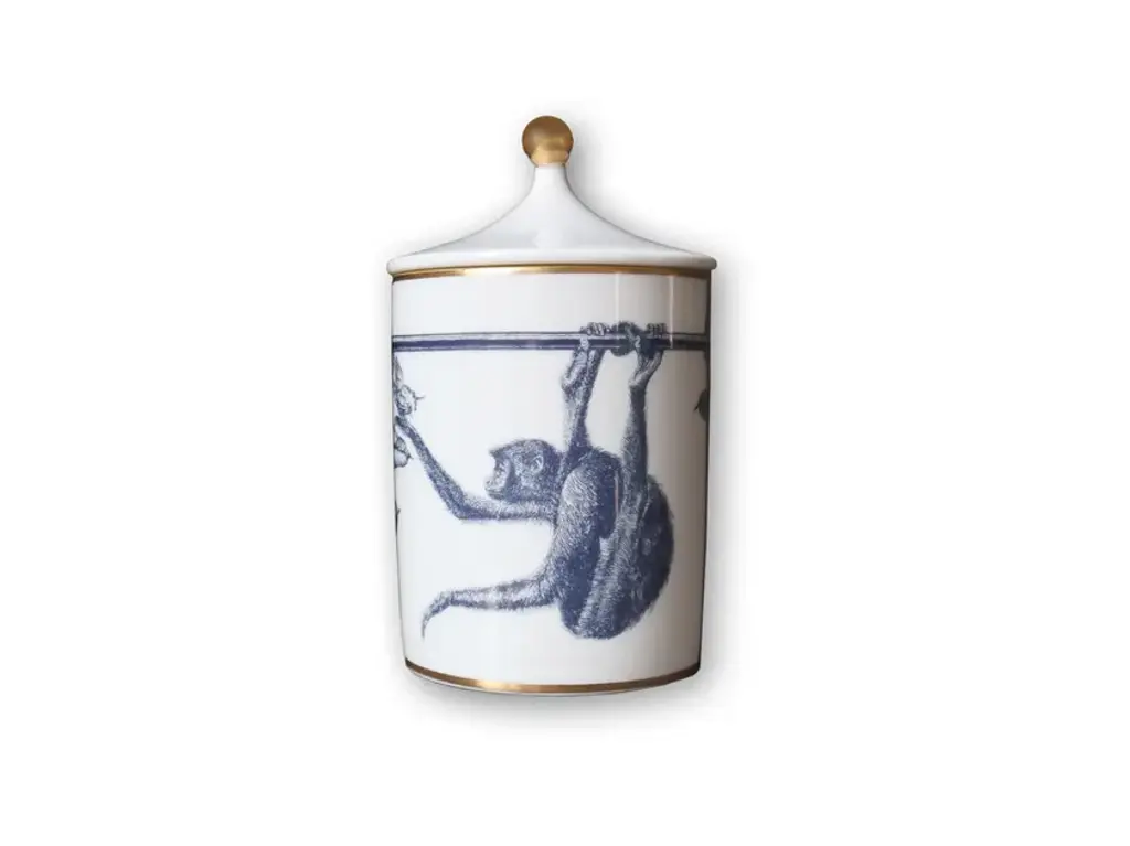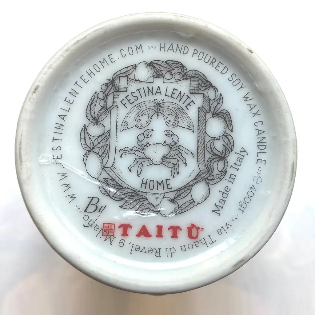 Notes of aromatic herbs and citrus blend to create the distinctive aroma of this scented candle made of pure soy wax, which burns through a thin wick in cotton and paper. Poured by hand in a porcelain container with lid developed by Taitù Milano celebrating the Festina Lente Home logo, the candle is inspired by the brand owner's childhood memories of summer vacations spent in the sunny Amalfi coast among pine forests and blood oranges. A luxe box completes the design of this candle (400 gr) that makes for a burning time of about 90 hours.