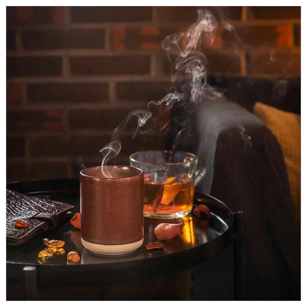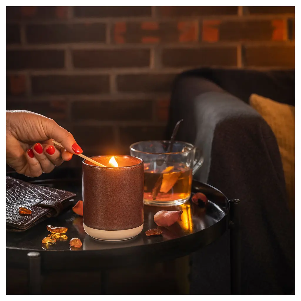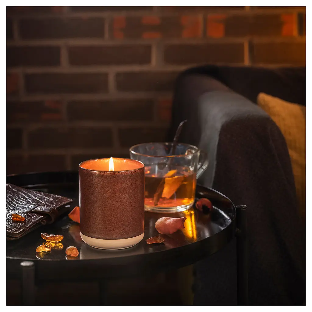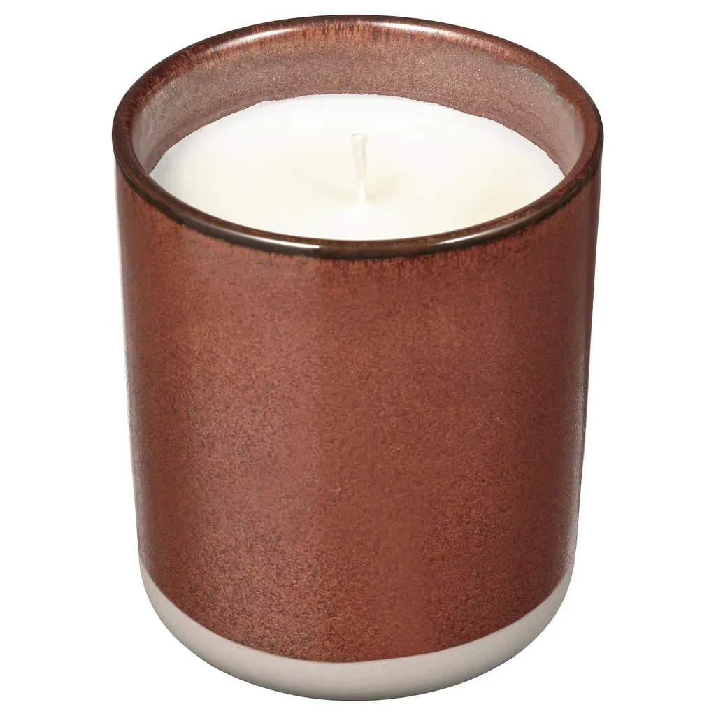 ROSENSLÅN Scented candle in ceramic jar - amber & rose/red/brown 45 hr. A calm and earthy experience of amber and roses. Suitable when you want to create a meditative atmosphere at home that’s inspired by the Far East. Never leave a burning candle unattended.