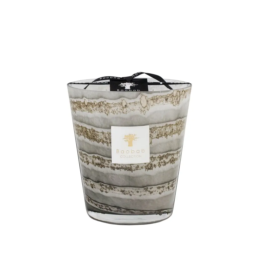 A hand-blown glass with subtle shades of gray was made by our glass artisans. Horizontal strata form gray stripes dotted with small round and organic shards. The Atacama scented candles are refined objects perfect for urban and chic interiors.