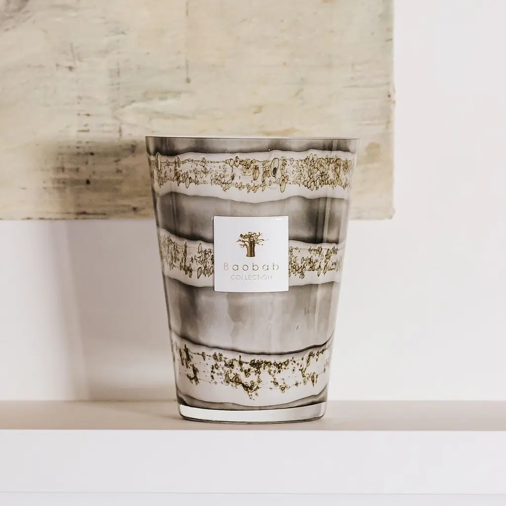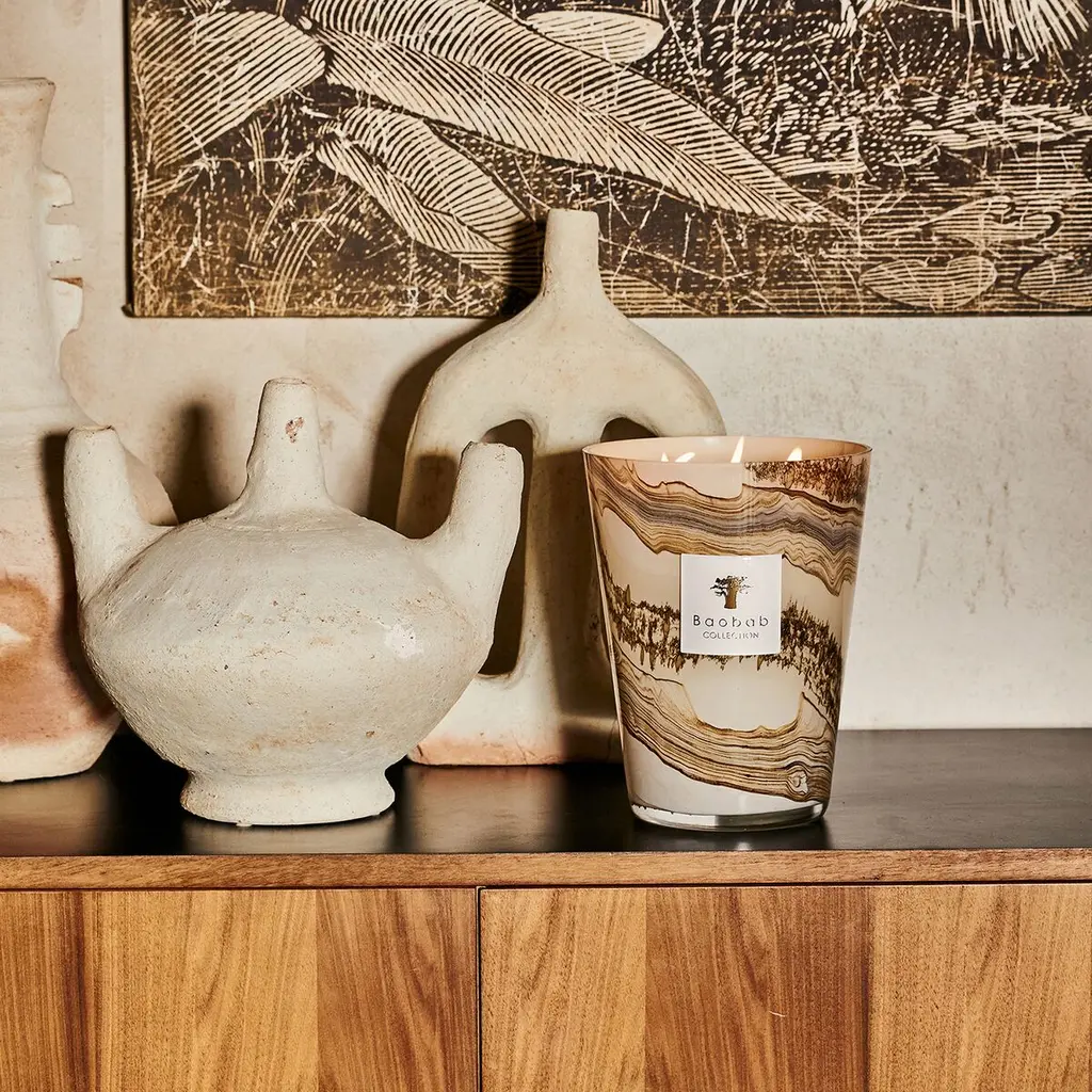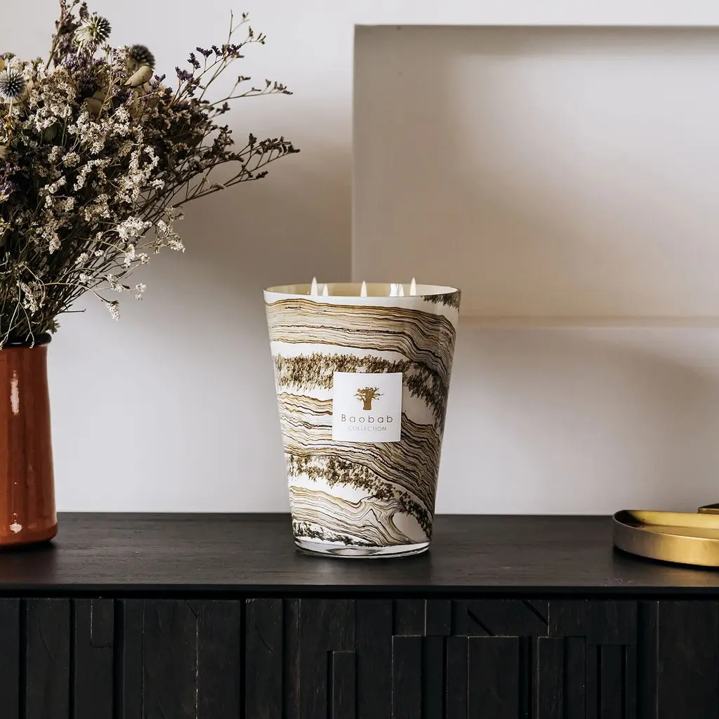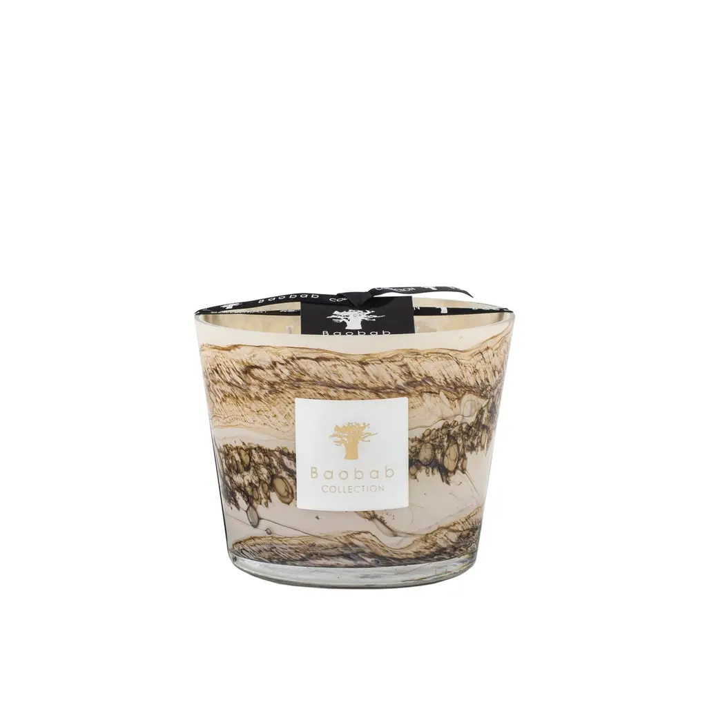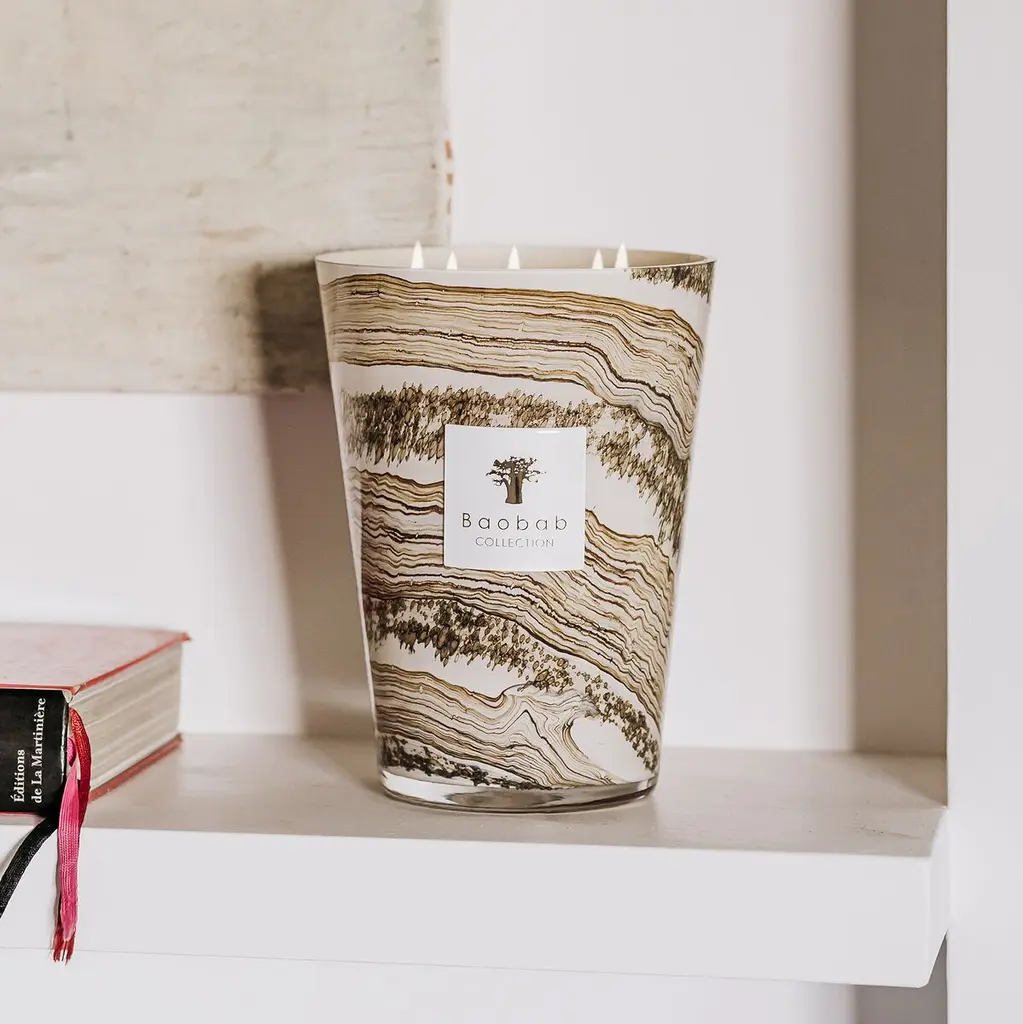 The hand-blown glasses of the candle showcase shades of beige and brown on which horizontal lines are formed with small organic and random specks. Each glass is unique, as the sandy color dissolves in the material according to the glass blower's breath.