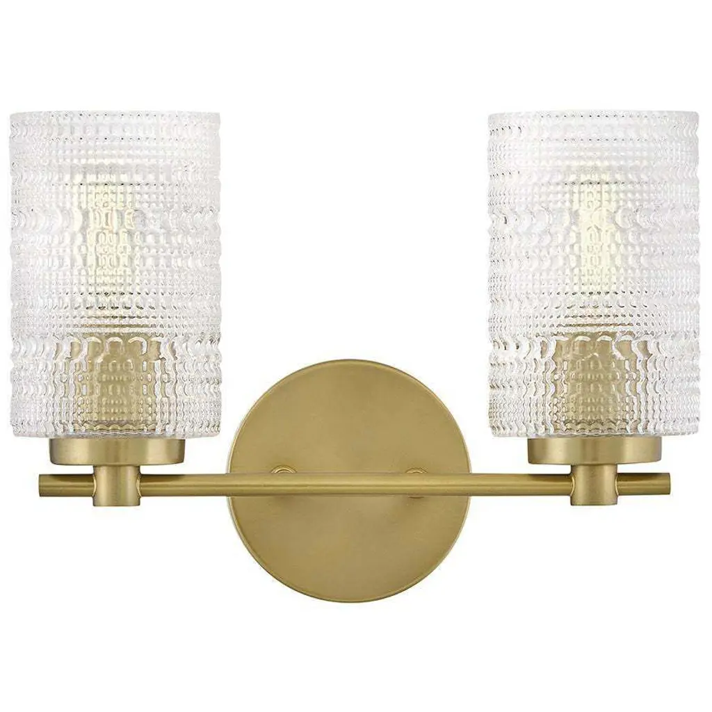 Collection: Candler, Material: Glass, Finish Color: Warm Brass, Width: 16.5", Height: 8.75", Depth: 7.5", Backplate Width: 5", Backplate Length: 5", Lamping Type: Incandescent, Number Of Bulbs: 2, Wattage: 60 Watts, Dimmable: Yes, Moisture Rating: Damp Rated, Desc: Infuse a bathroom with the vintage-inspired charm of the Candler 2-light bath bar from Savoy House. Two shades of tapered clear glass showcase a diamond pattern that adds texture, heightens the drama and recalls beautiful antique glassware. Warm Brass finish. Candler is 8.75" in height, 16.5" in width and extends 7.5" from the wall. Uses two candelabra size bulbs of up to 60 watts per bulb. Bulbs not included. This bath light is damp area rated and must be installed as shown.,