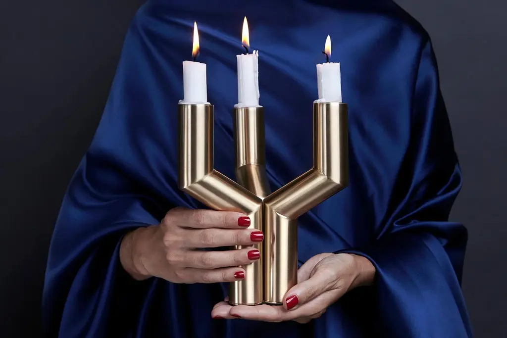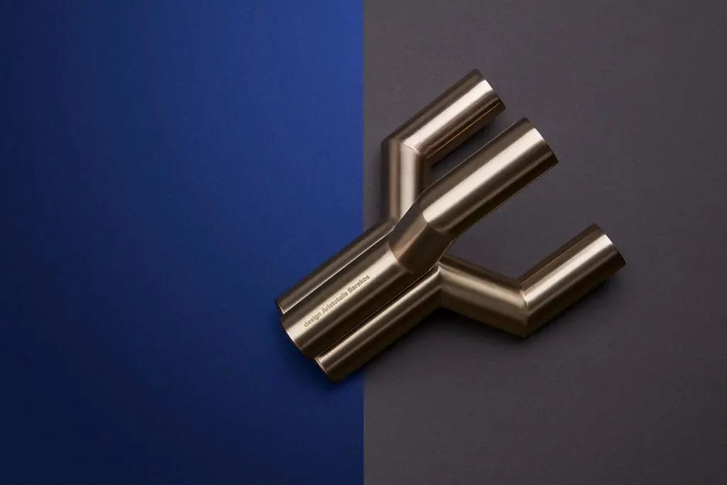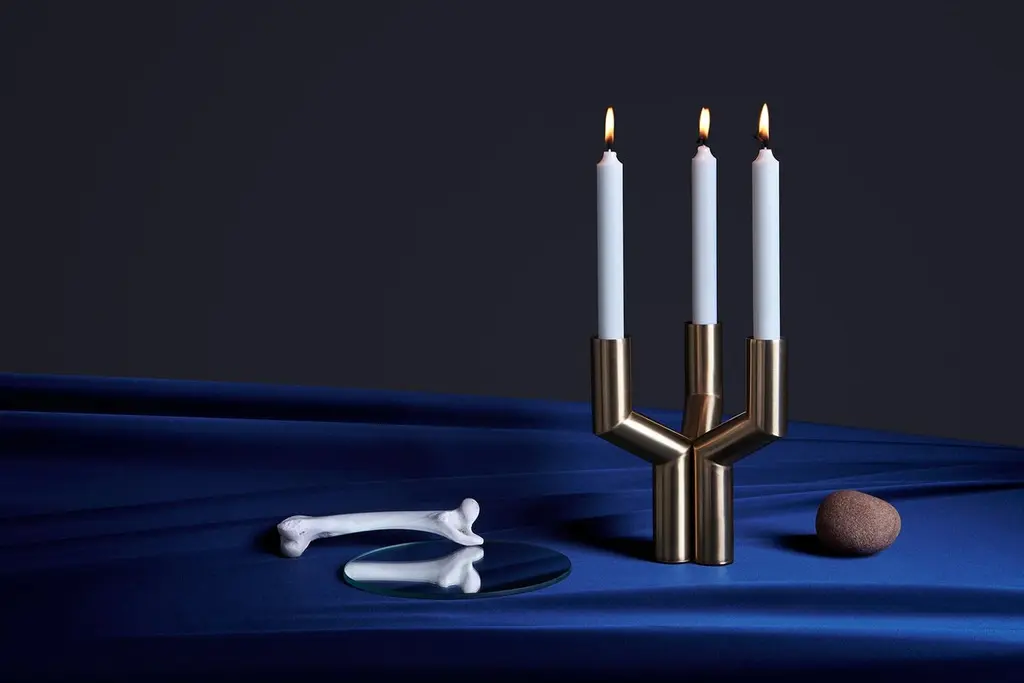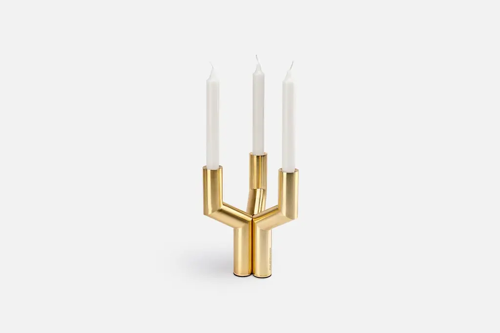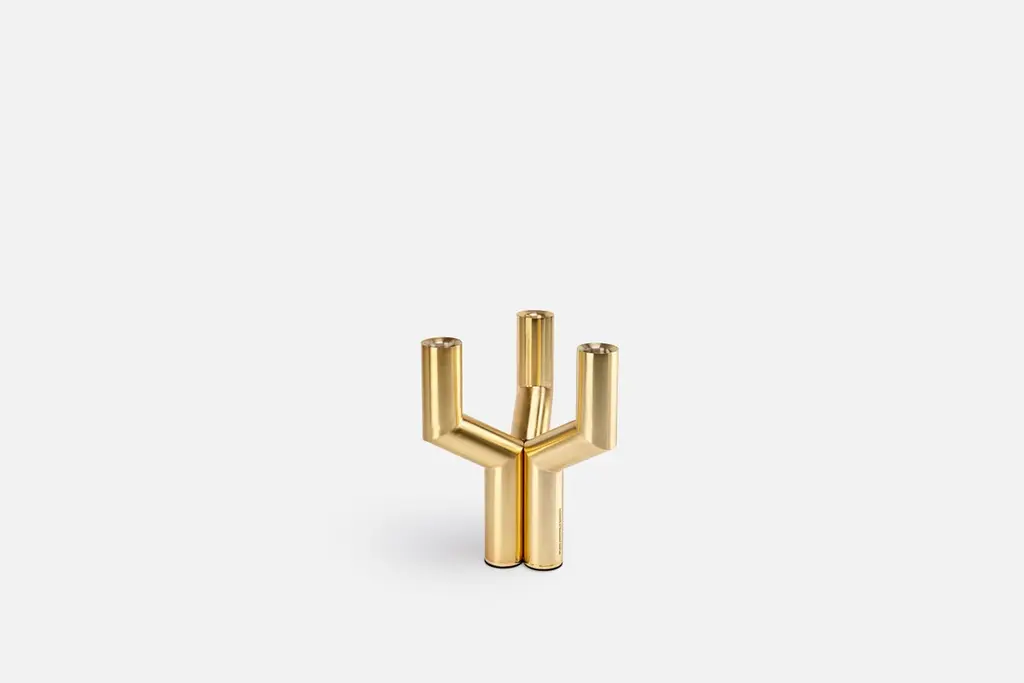 The Sermon candle holder, first released in 2021, celebrates Brutalist aesthetics and comes in two different finishes.The solid metal candle holder has been envisioned as an austere ritual artefact, a quality that lends it its name. It consists of three identical parts of welded brass tubes connected at their base, with each tube able to hold one candle. Its strict form and choice of material is a reference to the Brutalist architectural movement of the 1950s.Finish: Satin Brushed BrassDimensions: H 20, D 15, W: 17 cm
