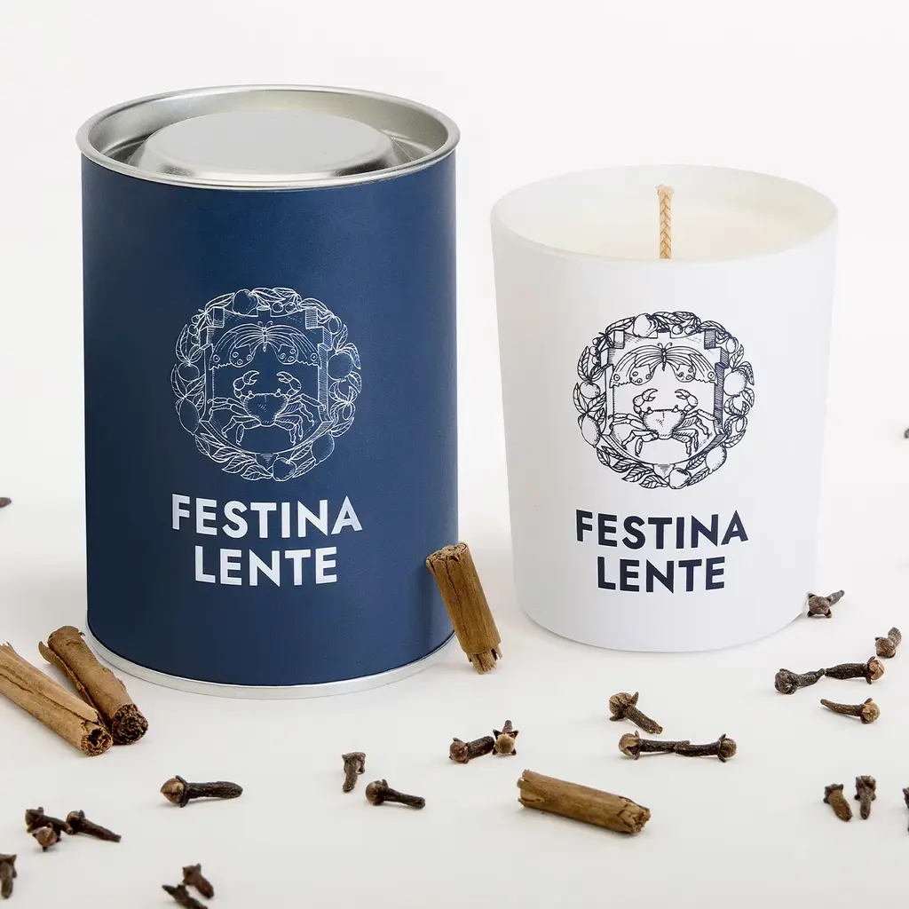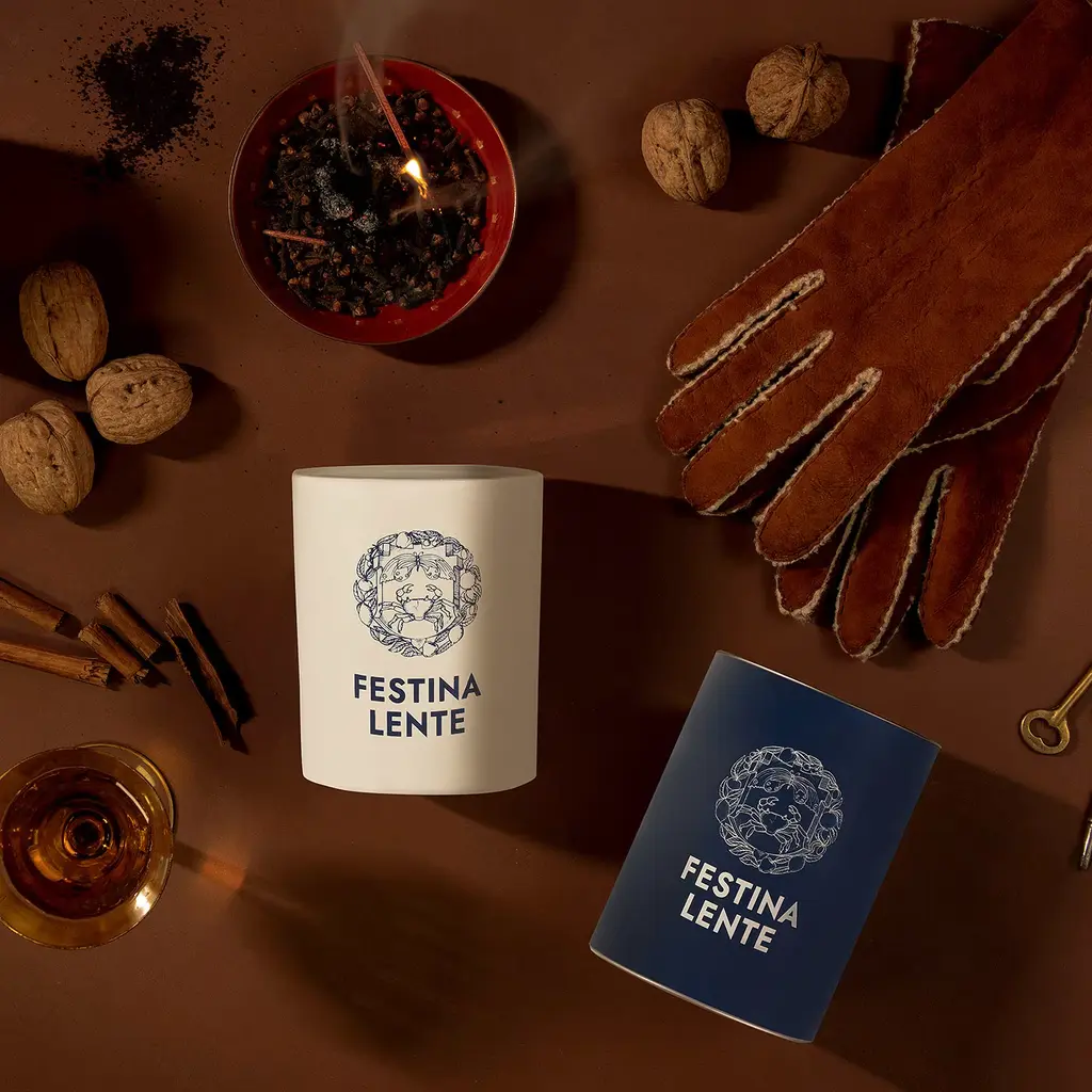 This candle is poured by hand in a white glass container with a glossy white finish printed with the Festina Lente Home logo in black, inspired by the symbols of the crab and the butterfly first appeared on gold coins minted for emperor Augustus in ancient Rome. The capacity of 220 gr (7.7 oz) makes for a total burning time of 45-50 hours. The candle comes in a container with a metal pressure lid. The wax is 100% pure soy wax with no GMO. All the fragrances are vegan, cruelty-free, and phthalate-free. The wick is in cotton and paper. The fragrance Il Viaggiatore (that means Traveler in Italian) has an intense scent of mulled wine and burning fireplace. The notes of cloves and cinnamon announce steaming glasses of mulled wine, full of the sweetness of autumn and its joyful aromas. Olfactory pyramid: Head: cloves, cinnamon, bergamot; Heart: incense, elemi, patchouli; Base: cedar wood, amber, oak moss needles.