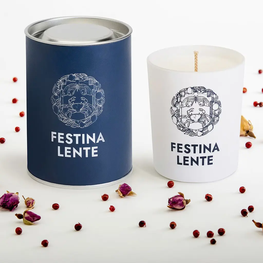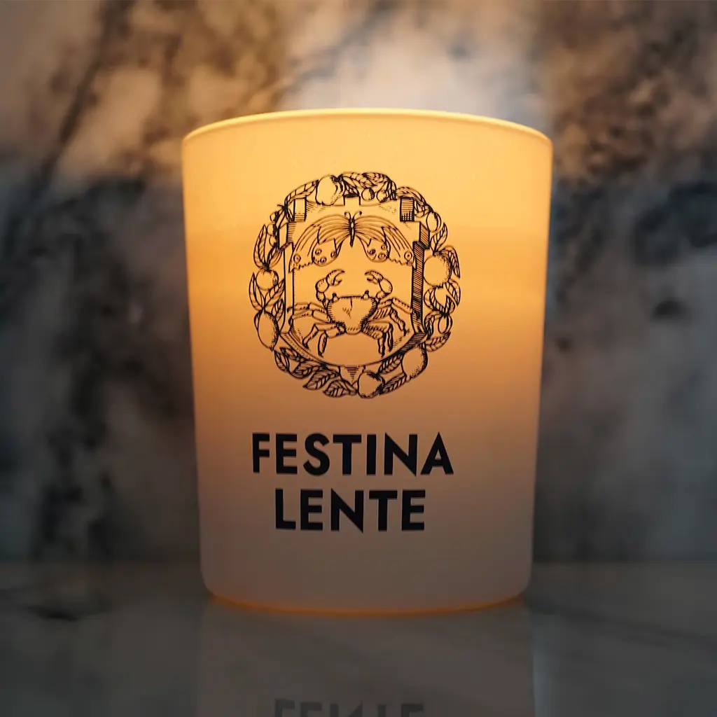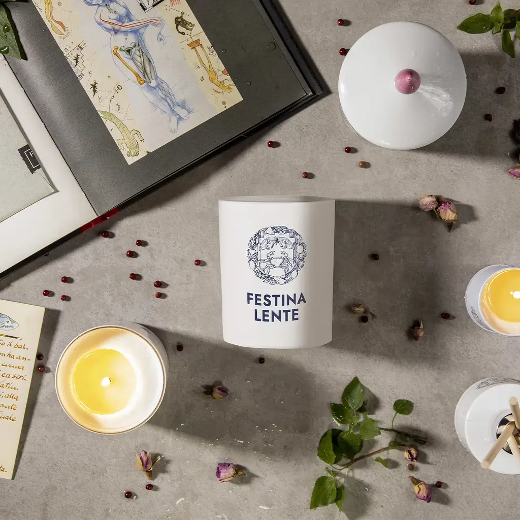 These candles are poured by hand in a white glass container with a white finish printed with the Festina Lente Home logo in black, inspired by the symbols of the crab and the butterfly that first appeared on gold coins minted for emperor Augustus in ancient Rome. The wax is 100% pure soy wax with no GMO. All the fragrances are vegan, cruelty-free, and phthalate-free. The wick is in cotton and paper. Olfactory pyramid: head rose, cloves heart cinnamon, patchouli base amber, sandal wood, musk.