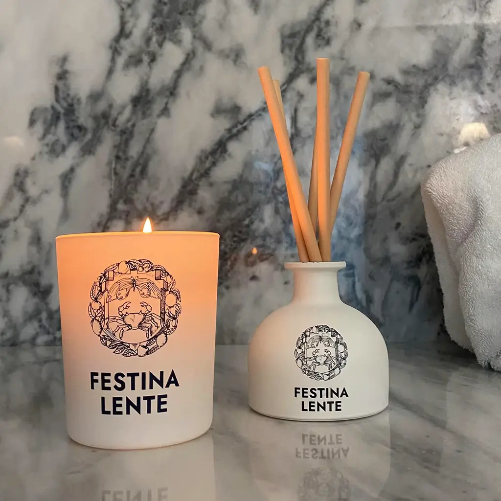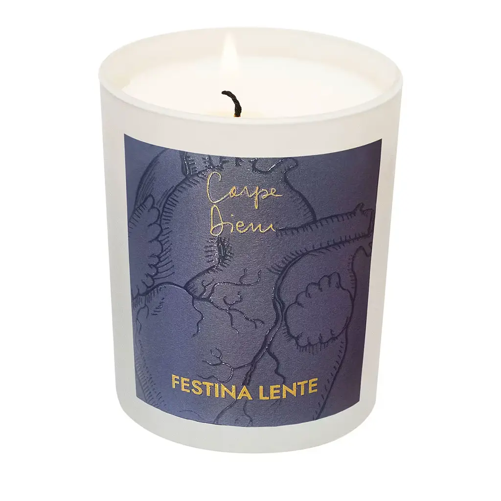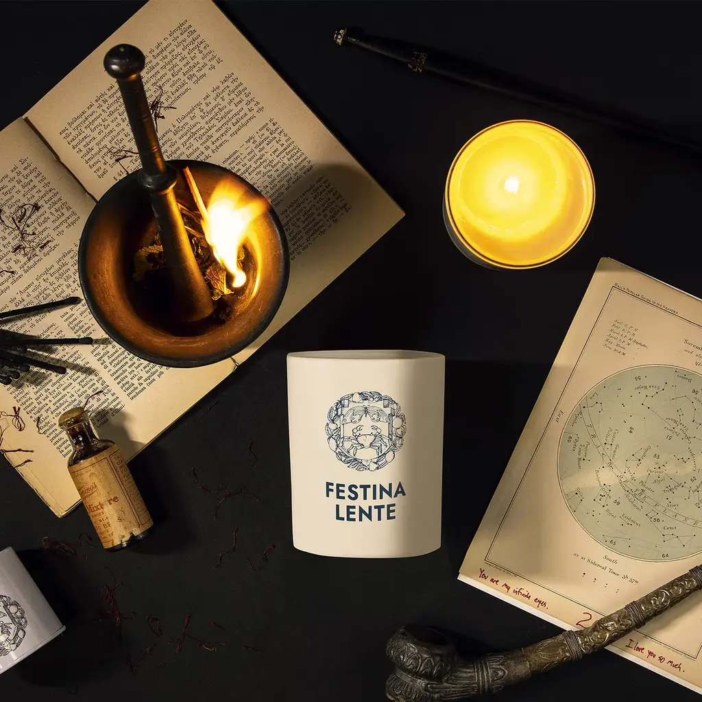This candle is poured by hand in a white glass container with a glossy white finish printed with the Festina Lente Home logo in black, inspired by the symbols of the crab and the butterfly first appeared on gold coins minted for emperor Augustus in ancient Rome. The capacity of 220 gr (7.7 oz) makes for a total burning time of 45-50 hours. The candle comes in a container with a metal pressure lid. The wax is 100% pure soy wax with no GMO. All the fragrances are vegan, cruelty-free, and phthalate-free. The wick is in cotton and paper. The Mistero scent is reminiscent of incense and stone. This complex and secret perfume tells the mystery of incense and the cold touch of stone when we finally reach an unknown destination. The journey takes us far and within us, opening doors on dark worlds that taste of spices, amber, and wood and remind us who we are speaking a new but known language. Olfactory pyramid: Head: incense, artemisia; Heart: opoponax, ylang ylang, saffron; Base: cedar wood, patchouli, amber.