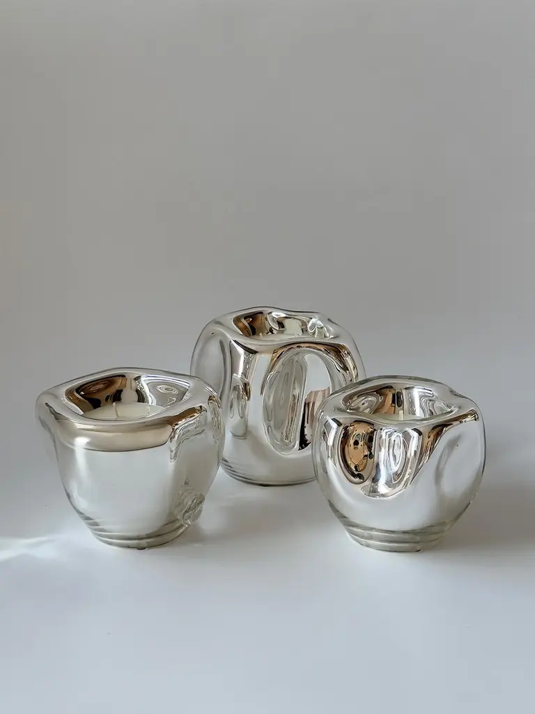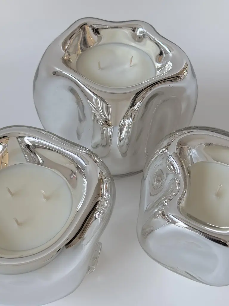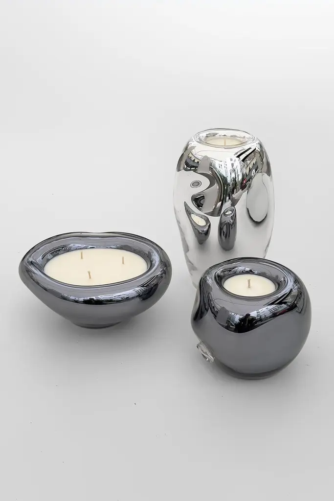 Set of 3 Lumi Candles by HomaDimensions: Big: W 25 x D 25 x H 25 cm, Medium: W 18 x D 18 x H 12 cm, Small: W 15 x D 15 x H 12 cm. Materials: Blown Glass. Silver Mirror.HOMA is a contemporary design atelier based in Istanbul. The atelier’s trademark processes are handblown glass, glass fusing and mirroring, created through the use of multidisciplinary techniques and materials. Over time, with meticulous research and experimentation HOMA has acquired unique expertise in mirrors, lighting and home interior objects thus elevating things of function to the status of art. Handcraft HOMA has discovered one of the last remaining masters of handcrafted mirroring in the Eastern Mediterranean. The atelier is original in its simultaneous use of different techniques to create organic and flowing mirror shapes. Each piece celebrates reflection, translucency, movement, light, time, multiple layering and aesthetic, spontaneity…Object HOMA’s pieces are an exploration of organic, abstract, as well as unexpected flowing lines and shapes. Our design service offer is presented in a catalogue of over 50 designs in fluid and geometric shapes achieved through multidisciplinary techniques.Materiality Through the use of mixed textures and the layering of mirror elements unexpected effects are created on glass, which play with one’s visual perception as well as the surrounding space. Glass, stone, marble, messing mirror techniques, bronze, wood and clay are just some of the Earth’s materials that find their way into HOMA’S offerings. HOMA offers a vast materials library.Architecture Formally trained in interior architecture, HOMA founder, Tuğba Koç has transformed her knowledge and experience into layered aesthetic design objects. Now, with a team of architects and artisans, Tuğba applies her hands in a workshop environment on interior and exterior objects to enrich earth-derived, breathing, living materials. HOMA’s interior objects are informed by art and driven by the philosophy that nothing artificial should be allowed to interfere with the energy of one’s living environment.