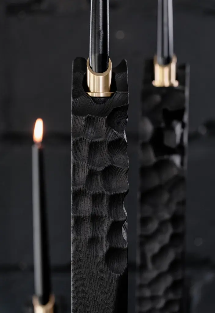 Set of 5 unique roots candles by Jeremy Descamps.Unique pieces.Materials: candles in solid oak from the country burned in flam, inserts in brass, support of candles in brass.Dimensions: 2 small 40x20x 20cm. 1 Medium 80 x 20 x 20cm. 2 Large 120 x 20 x 20cm.Even in the darkest places, where everything is black, a small flame is enough to illuminate.These candlesticks symbolize the hope that can be found in all places, in all circumstances. They are the light that we bring to magnify the black, give it its relief, its nuances, its texture.Each flame represents the light which sleeps or which burns in you.The wooden foot is like roots coming out of the earth to draw the essential energy for life.Description:Candles in solid oak from the country burned in flam, inserts in brass, support of candles in brass.Jeremy Descamps Born in Namur, July 7, 1987 Always attracted to manual trades, he went on to study as a lathe miller and made it his profession for more than ten years. It was in 2016 that he used his technical skills and his sensitivity to make his first creations, which will remain in the private sphere. It was the interest that these creations aroused in his entourage that prompted him to take the plunge and embark on the LFN adventure. He therefore embarked on the creation of tailor-made furniture for private and professional alike. This has enabled him to have nice collaborations such as the one with the Hors Champs restaurant. He also creates an annual collection, ORIGIN, made up of a range of home accessories, produced in very small series. Today LFN is evolving.Custom-made creations give way to total and unconstrained creation in the world of fine art furniture. He decides to present his creations made of wood only under the "Shu sugi ban" technique to mark his identity, his DNA, his black country in deep black (= Charleroi)He learns the previous gestures to cut and shape stone, a material he is particularly fond of. Supported by the benevolence of a former stonemason well known in Belgian quarries, it is the energy of the past that resurfaces in his creationsBrass makes its entry, as well as copper.Jeremy is an artist whose main concern is to share, provide emotions, give meaning to objects, sublimate shades of black, textures.He meets people, in particular that of Caroline NOTTE, architect whose presentations are no longer to be made.From this meeting was born a collaboration since she offered to exhibit two creations in his famous house designed by Louis Herman De Koninck.A great introduction to the world of fine art furniture, as well as the various requests from the famous VILLAS magazine to appear in their issues.