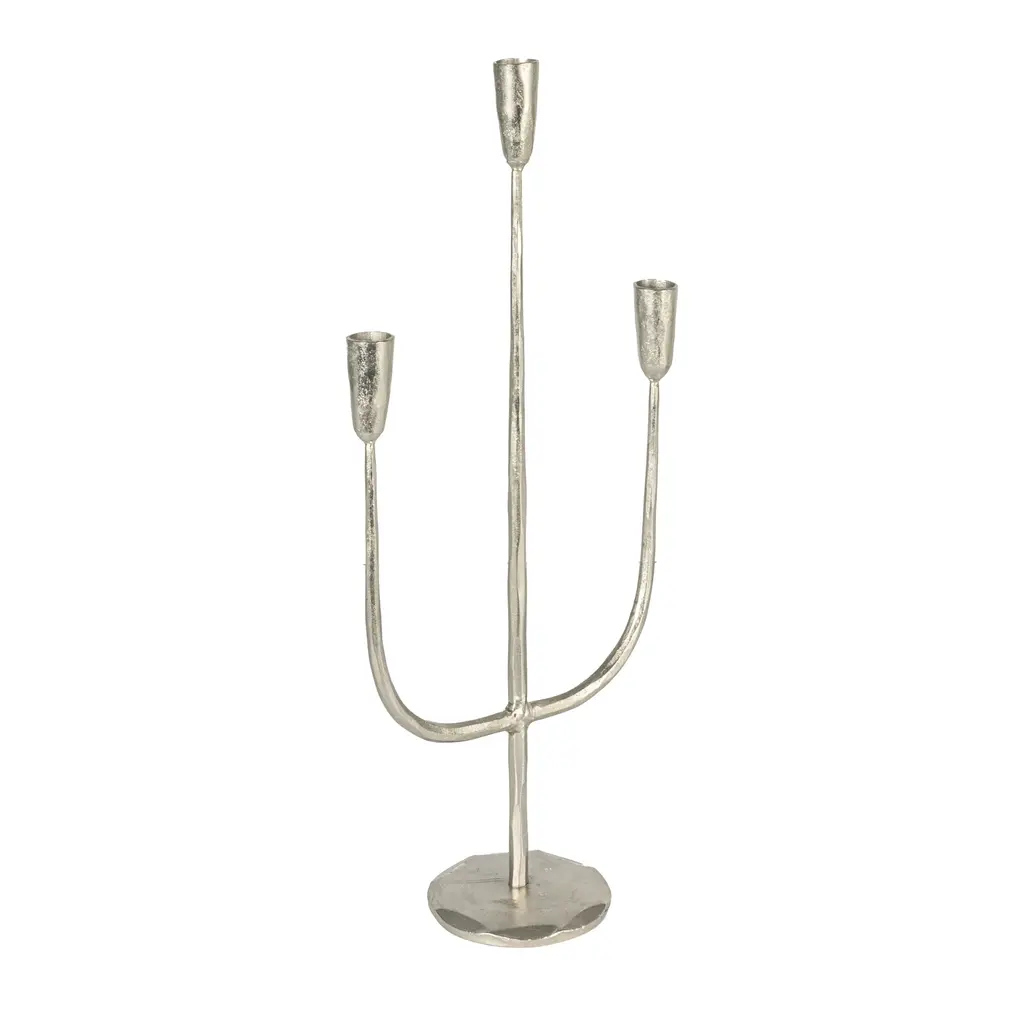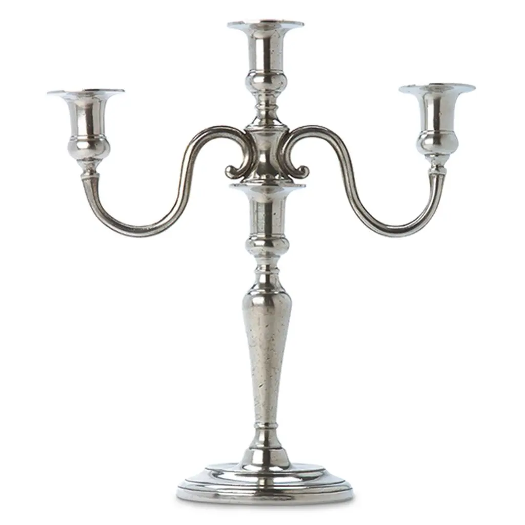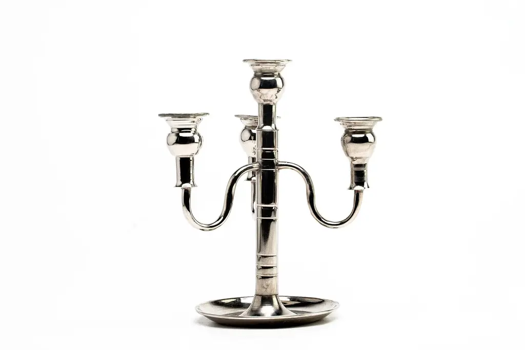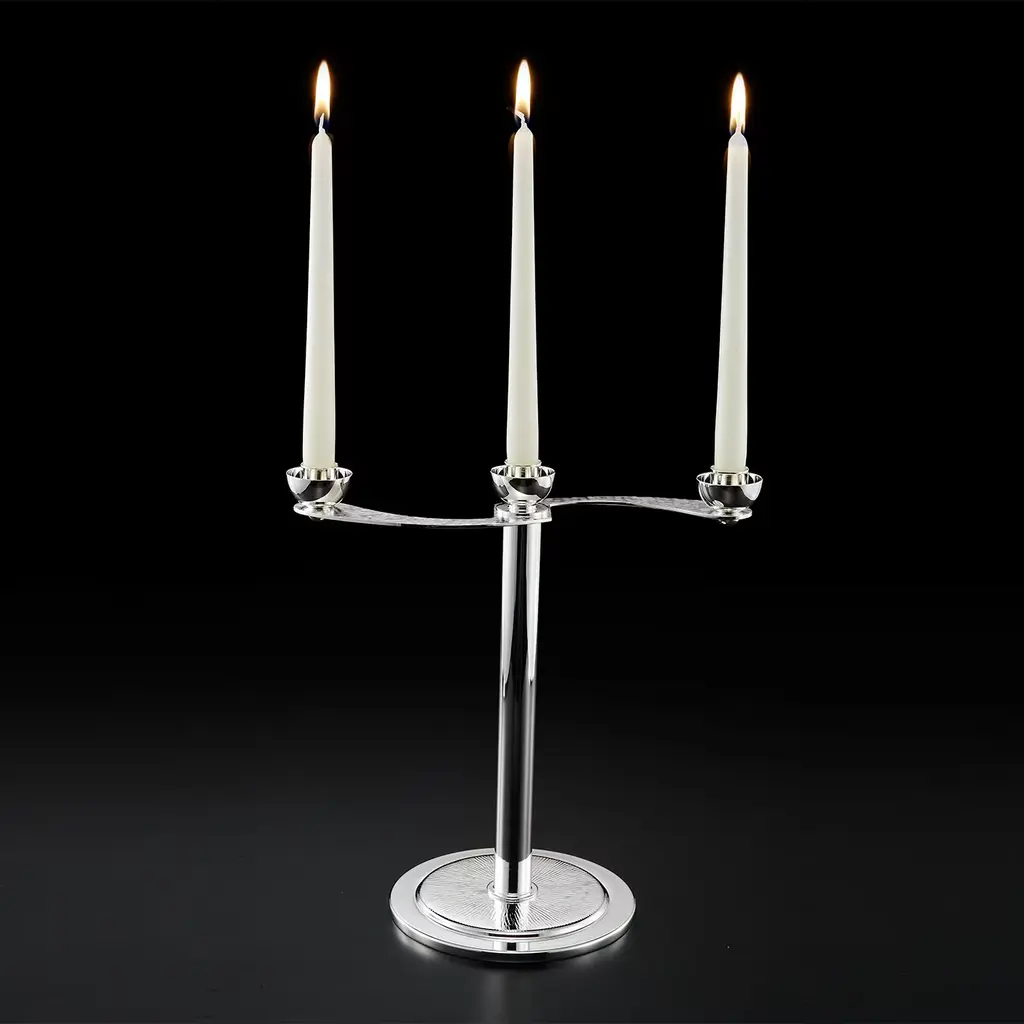 Beautiful candelabra holds three candles and is elegantly constructed in a silver-plated alloy. The candelabra can be separated into two pieces, with the top holding candles and the base becoming a vase. The arms of the candelabra are also movable.
