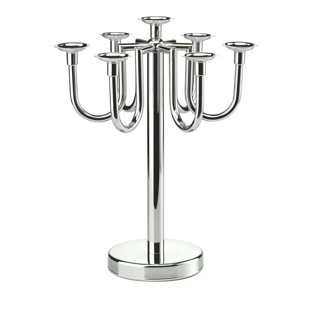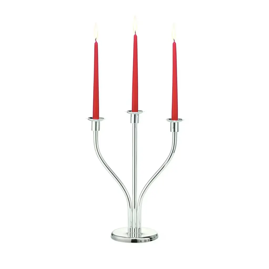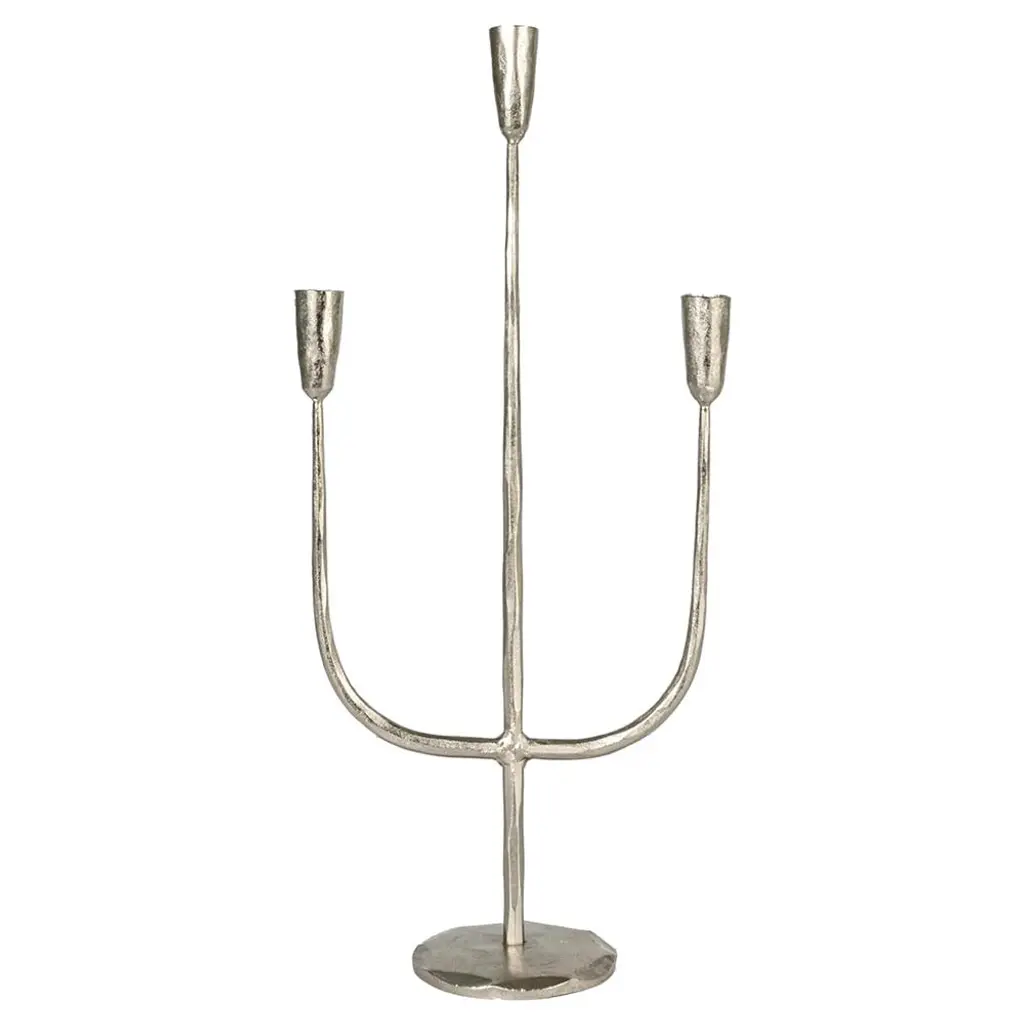 Beautiful candelabra holds three candles and is elegantly constructed in a silver-plated alloy. The candelabra can be separated into two pieces, with the top holding candles and the base becoming a vase. The arms of the candelabra are also movable.
