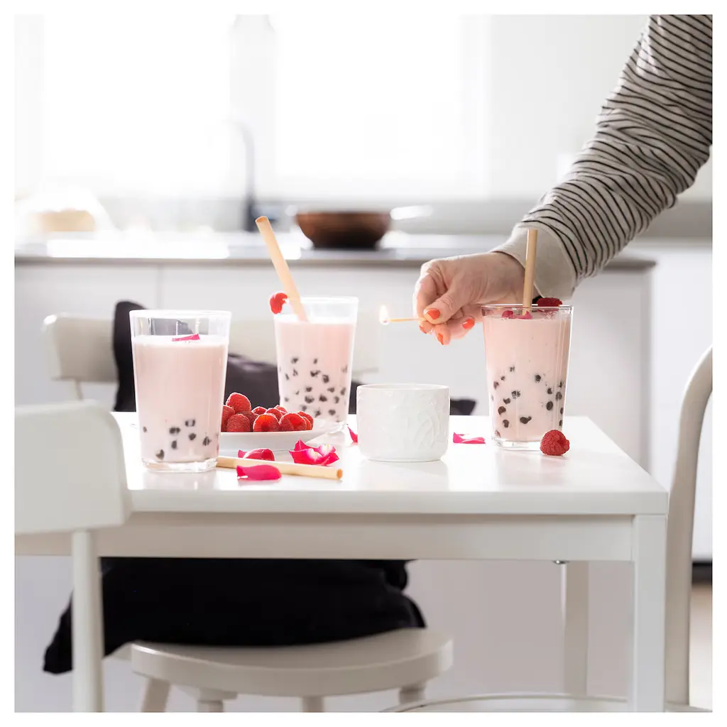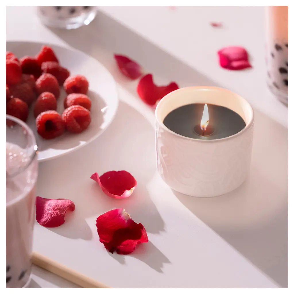 SÖTRÖNN Scented candle in ceramic jar - white 25 hr. A sweet vanilla scent with raspberries, strawberries and hints of roses. Suitable when you want to create a welcoming atmosphere at home with inspiration from the scent of red berries. Never leave a burning candle unattended.