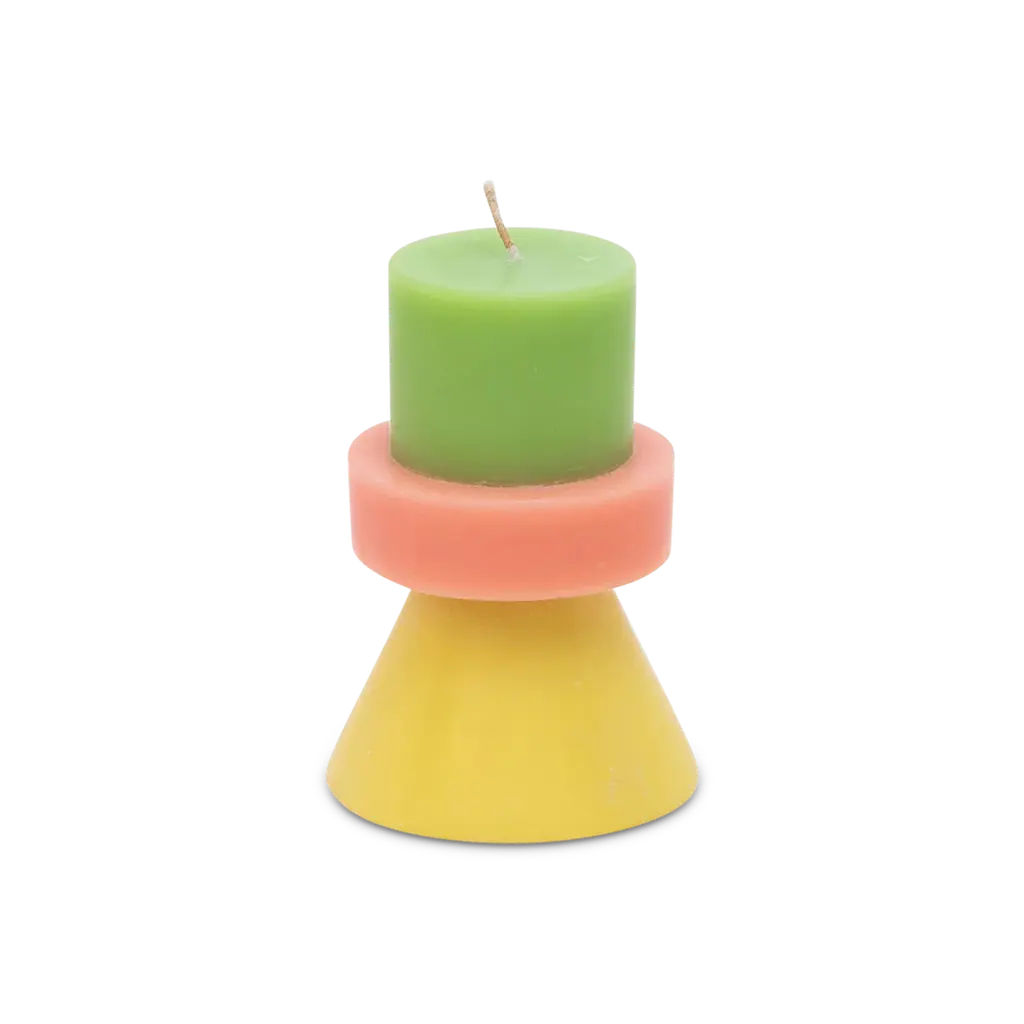 Vibrant colors and sculptural forms come together in the Stack Candle collection from Yod and Co. The mini version of the design features the range’s signature conical, ring, and cylindrical forms, but in smaller sizes. Stacked in a totem-like object, the candle brightens any space, whether lit or not. Carefully chosen, the color combinations add a fun accent to a room. Handcrafted in Indonesia, each candle is skillfully made by hand by Fair Trade craftspeople who pour the wax layer by layer to create the multi-colored effect. The Yod and Co Stack Candle Mini is made from paraffin-free 100% stearin wax and an eco-friendly dye. This mini version has a burning time of around 20 hours.