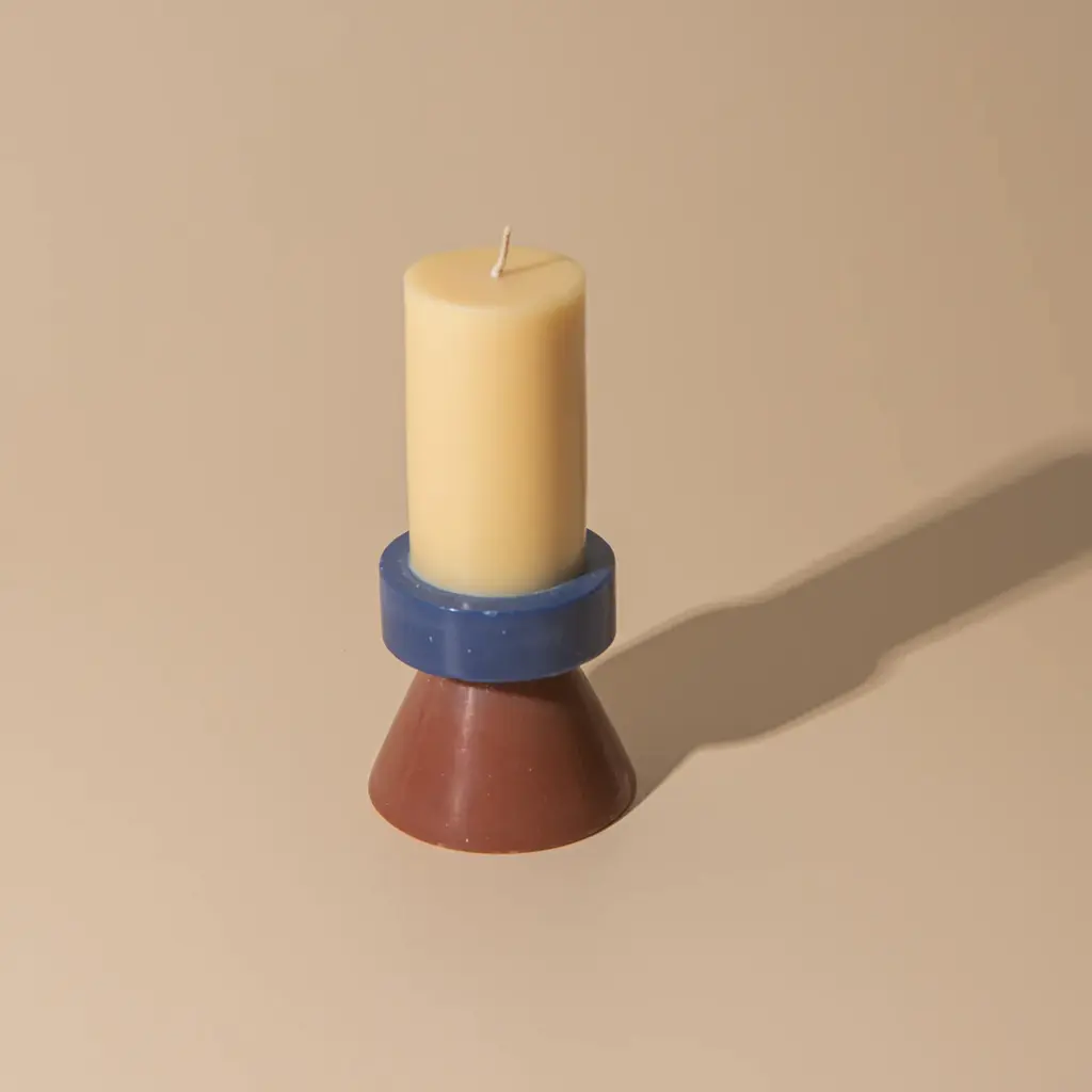Bright colors and bold geometric forms with clean lines give the classic pillar candles an artistic twist. Part of the Yod and Co collection, the Stack Candle brightens living spaces with its totem-like design. This candle features three different shapes in different colors, all stacked together in a sculptural composition: a conical base, a ring-shaped middle, and a cylindrical top that holds the cotton wick. Chosen with care, the color combinations enhance the eye-catching design further. Individually hand-poured in Indonesia, each candle is one of a kind. Yod and Co works with Fair Trade artisans to produce this collection. The candles are paraffin-free and are made with 100% stearin wax and ecological color dye. The tall version of the Yod and Co Stack Candles has a burning time of 30 hours.