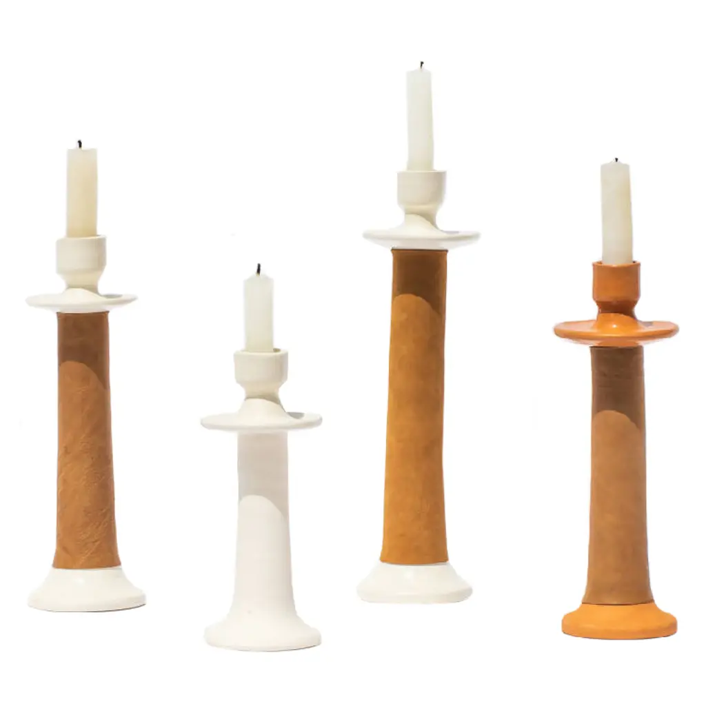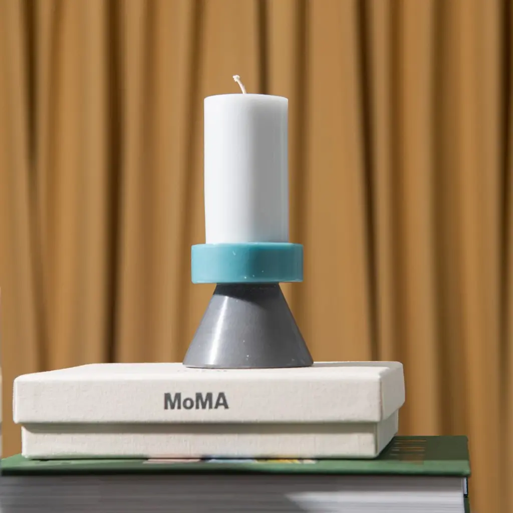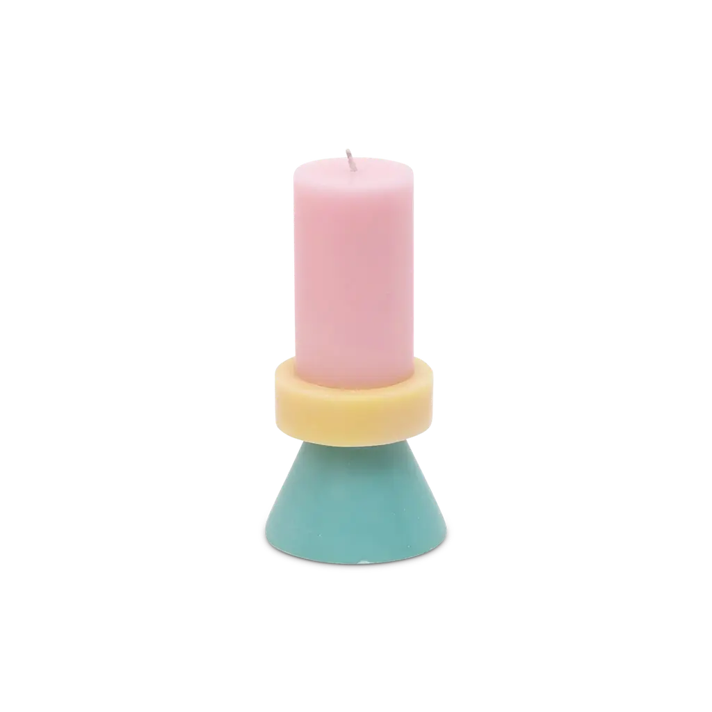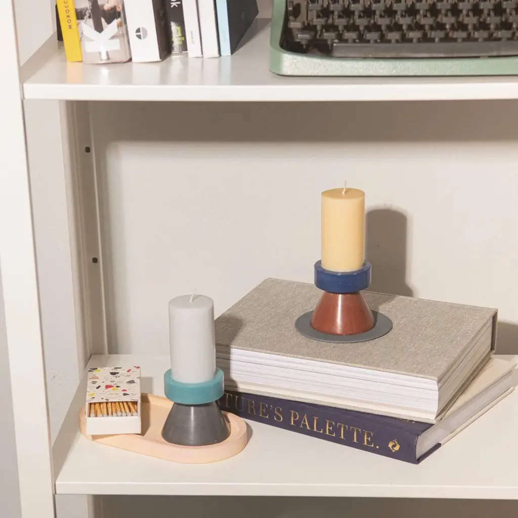 Bright colors and bold geometric forms with clean lines give the classic pillar candles an artistic twist. Part of the Yod and Co collection, the Stack Candle brightens living spaces with its totem-like design. This candle features three different shapes in different colors, all stacked together in a sculptural composition: a conical base, a ring-shaped middle, and a cylindrical top that holds the cotton wick. Chosen with care, the color combinations enhance the eye-catching design further. Individually hand-poured in Indonesia, each candle is one of a kind. Yod and Co works with Fair Trade artisans to produce this collection. The candles are paraffin-free and are made with 100% stearin wax and ecological color dye. The tall version of the Yod and Co Stack Candles has a burning time of 30 hours.
