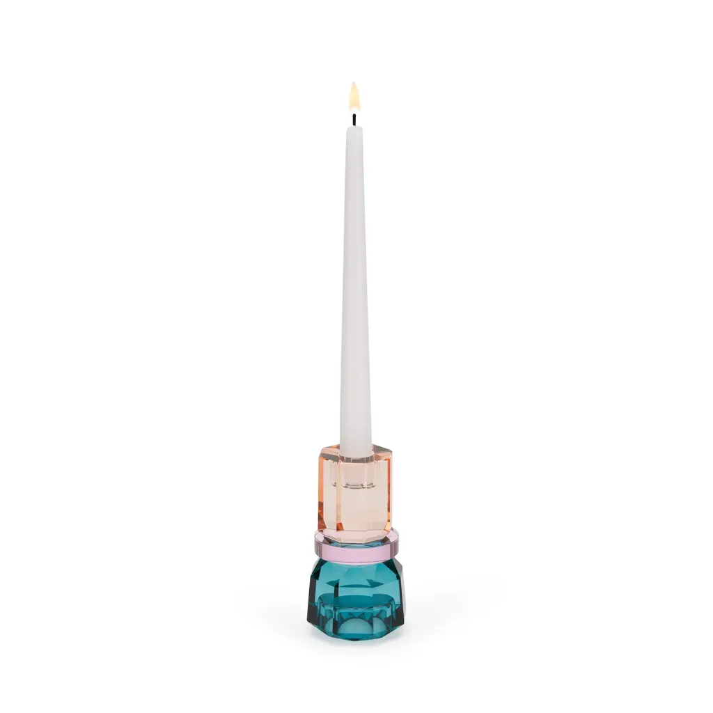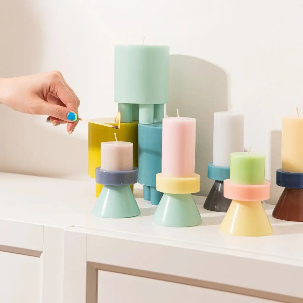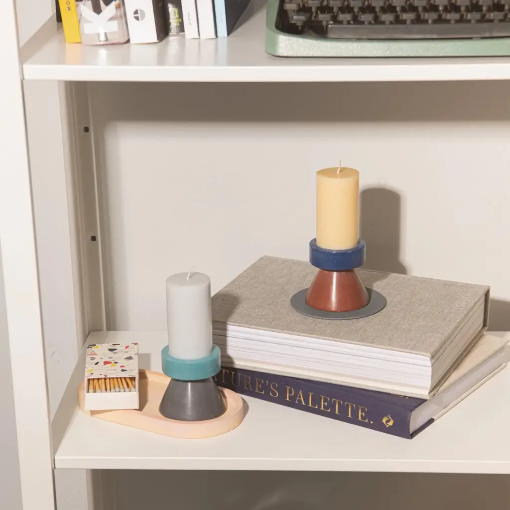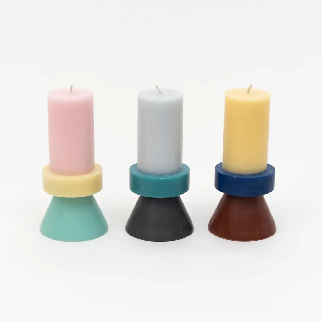 Bright colors and bold geometric forms with clean lines give the classic pillar candles an artistic twist. Part of the Yod and Co collection, the Stack Candle brightens living spaces with its totem-like design. This candle features three different shapes in different colors, all stacked together in a sculptural composition: a conical base, a ring-shaped middle, and a cylindrical top that holds the cotton wick. Chosen with care, the color combinations enhance the eye-catching design further. Individually hand-poured in Indonesia, each candle is one of a kind. Yod and Co works with Fair Trade artisans to produce this collection. The candles are paraffin-free and are made with 100% stearin wax and ecological color dye. The tall version of the Yod and Co Stack Candles has a burning time of 30 hours.