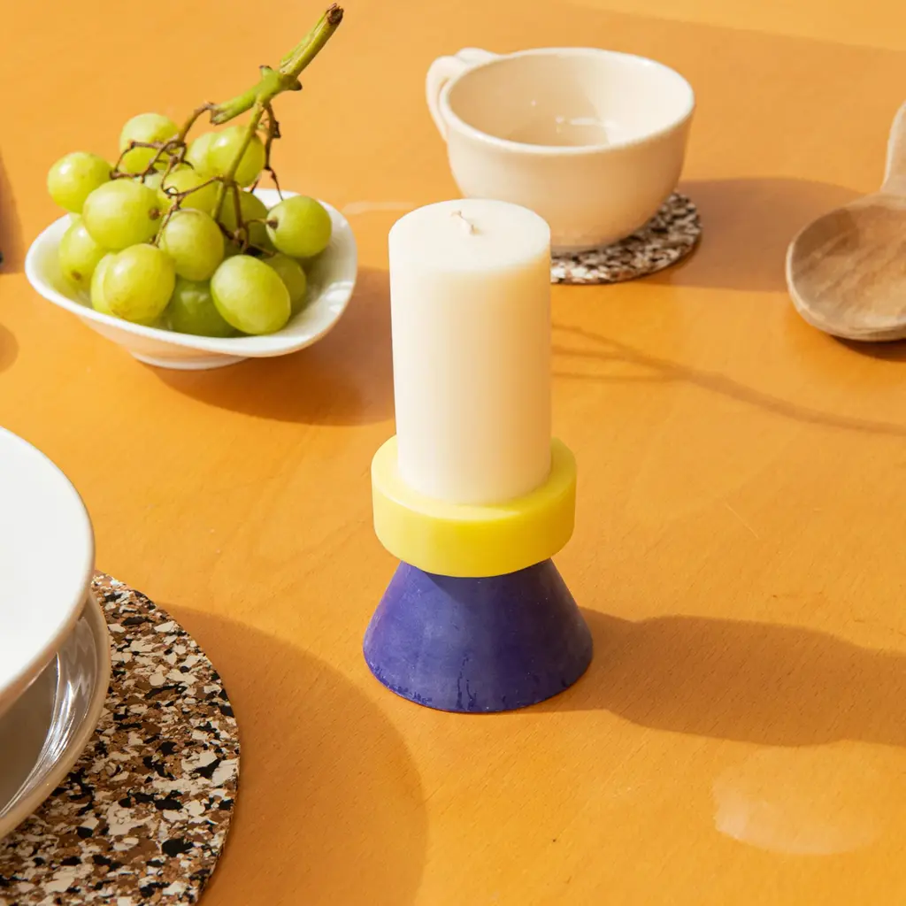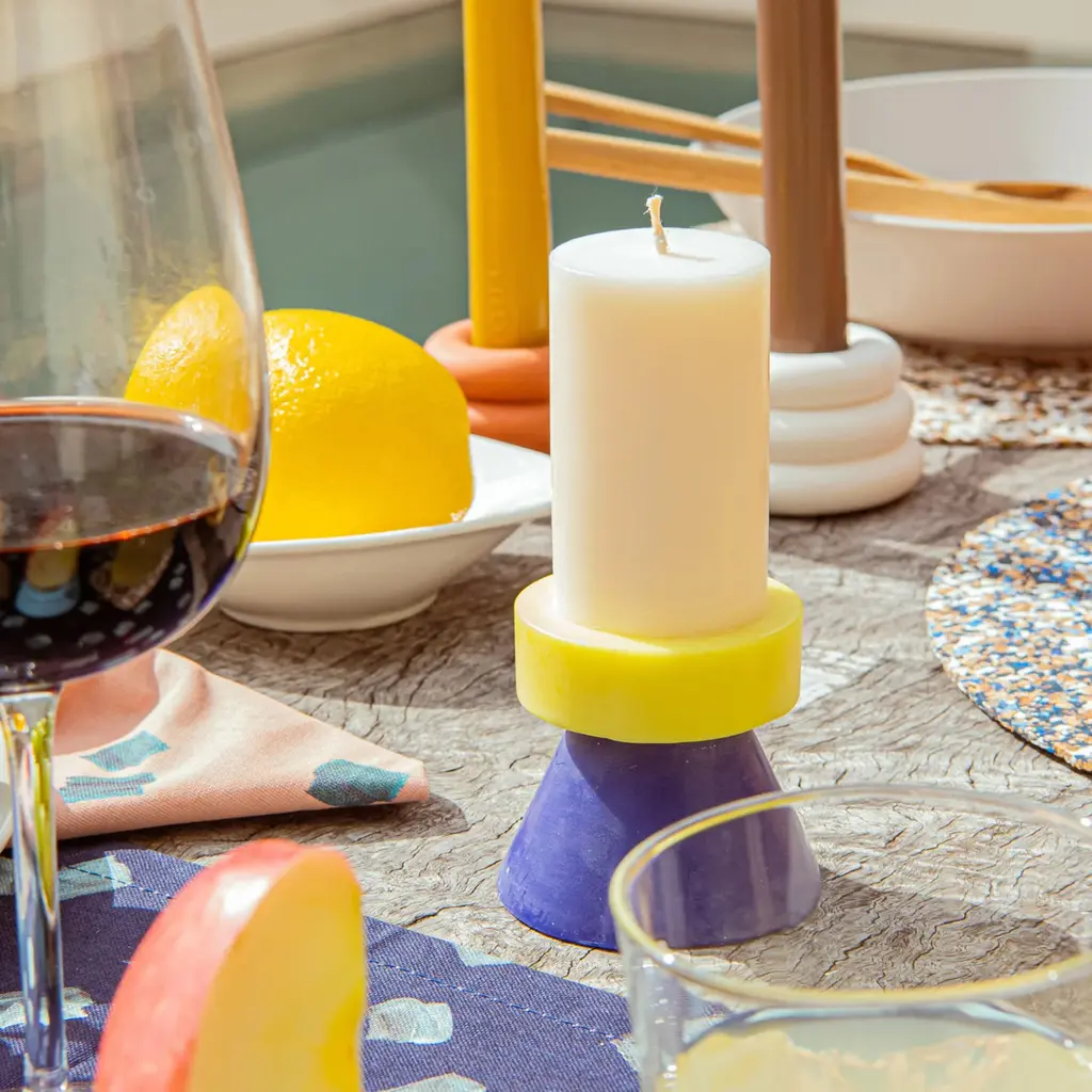 Bright colors and bold geometric forms with clean lines give the classic pillar candles an artistic twist. Part of the Yod and Co collection, the Stack Candle brightens living spaces with its totem-like design. This candle features three different shapes in different colors, all stacked together in a sculptural composition: a conical base, a ring-shaped middle, and a cylindrical top that holds the cotton wick. Chosen with care, the color combinations enhance the eye-catching design further. Individually hand-poured in Indonesia, each candle is one of a kind. Yod and Co works with Fair Trade artisans to produce this collection. The candles are paraffin-free and are made with 100% stearin wax and ecological color dye. The tall version of the Yod and Co Stack Candles has a burning time of 30 hours.