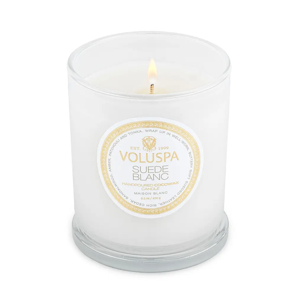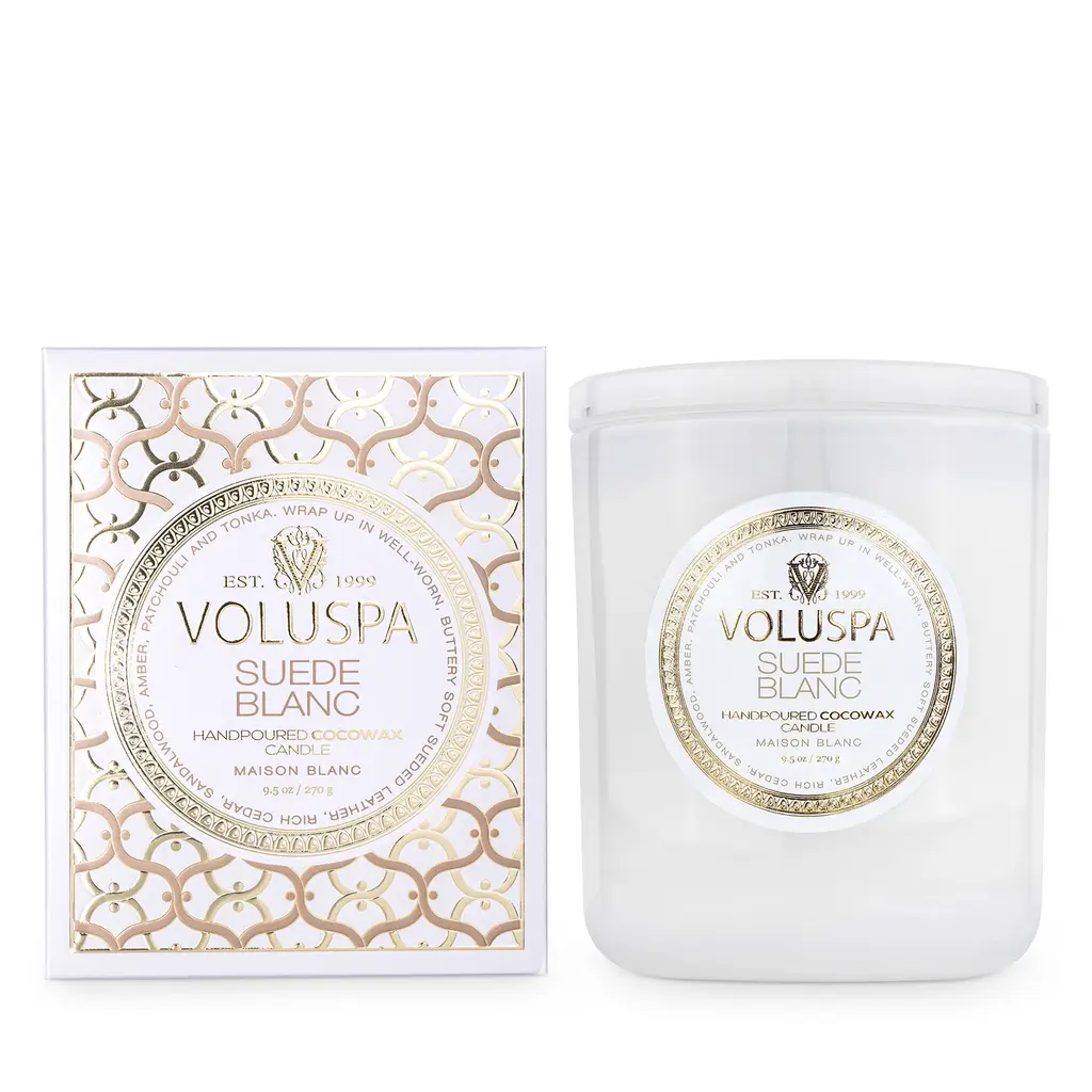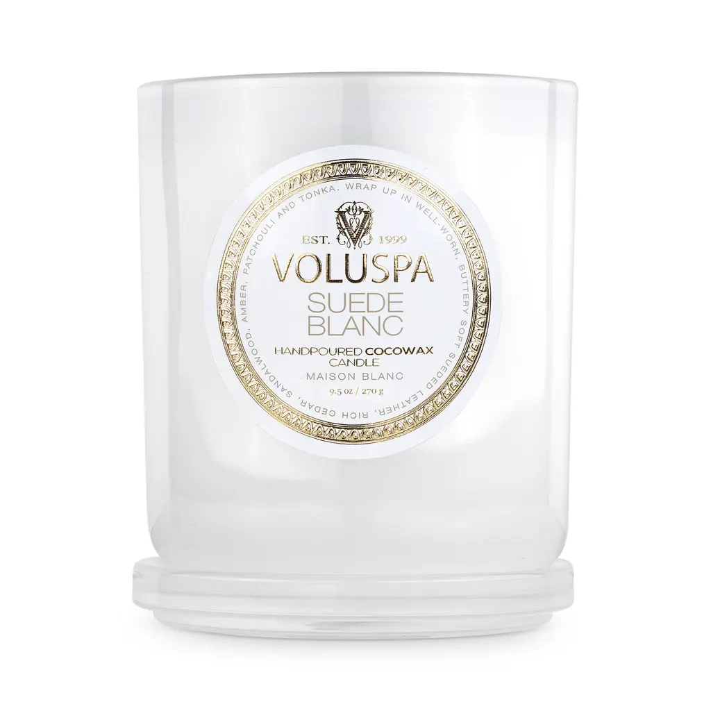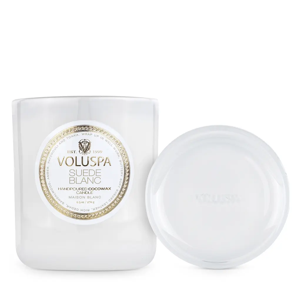A collection of Voluspa scents with notes of soft sueded leather, cedar, sandalwood, amber, patchouli and tonka.