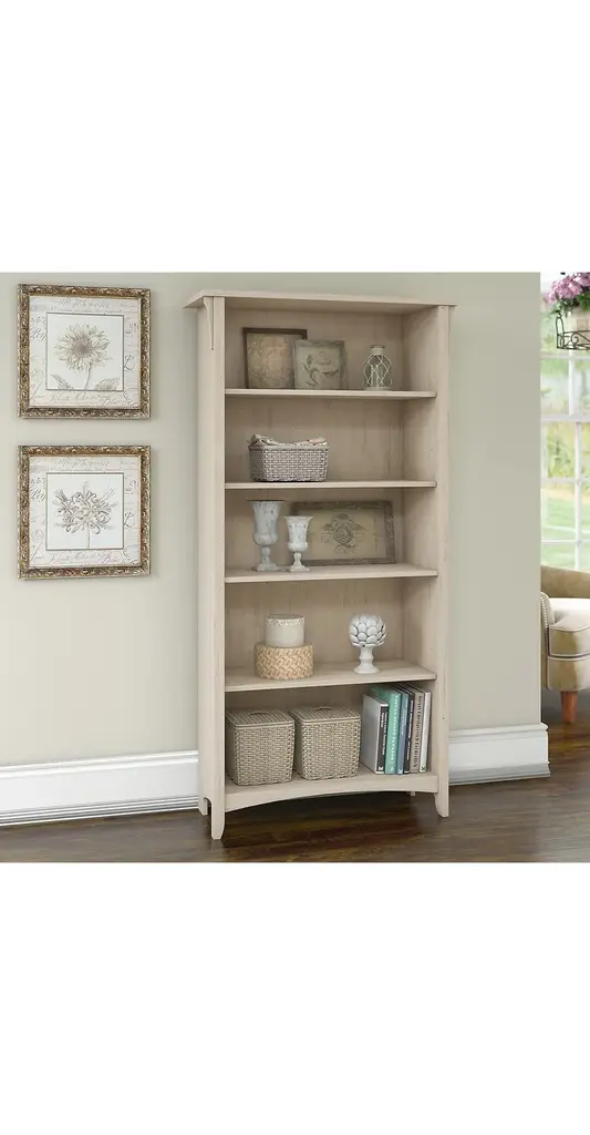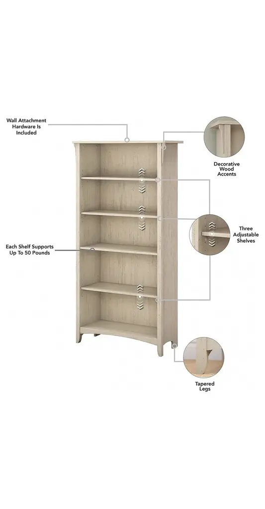 5 Shelf Bookcase feels comfortable anywhere from a cottage to a family home or apartment3 adjustable shelves for storage and display flexibility2 fixed shelves for stabilityTapered legs, curved base rails and decorative wood accents inspired by timeless Mission styleDimensions: 32W x 13D x 63H