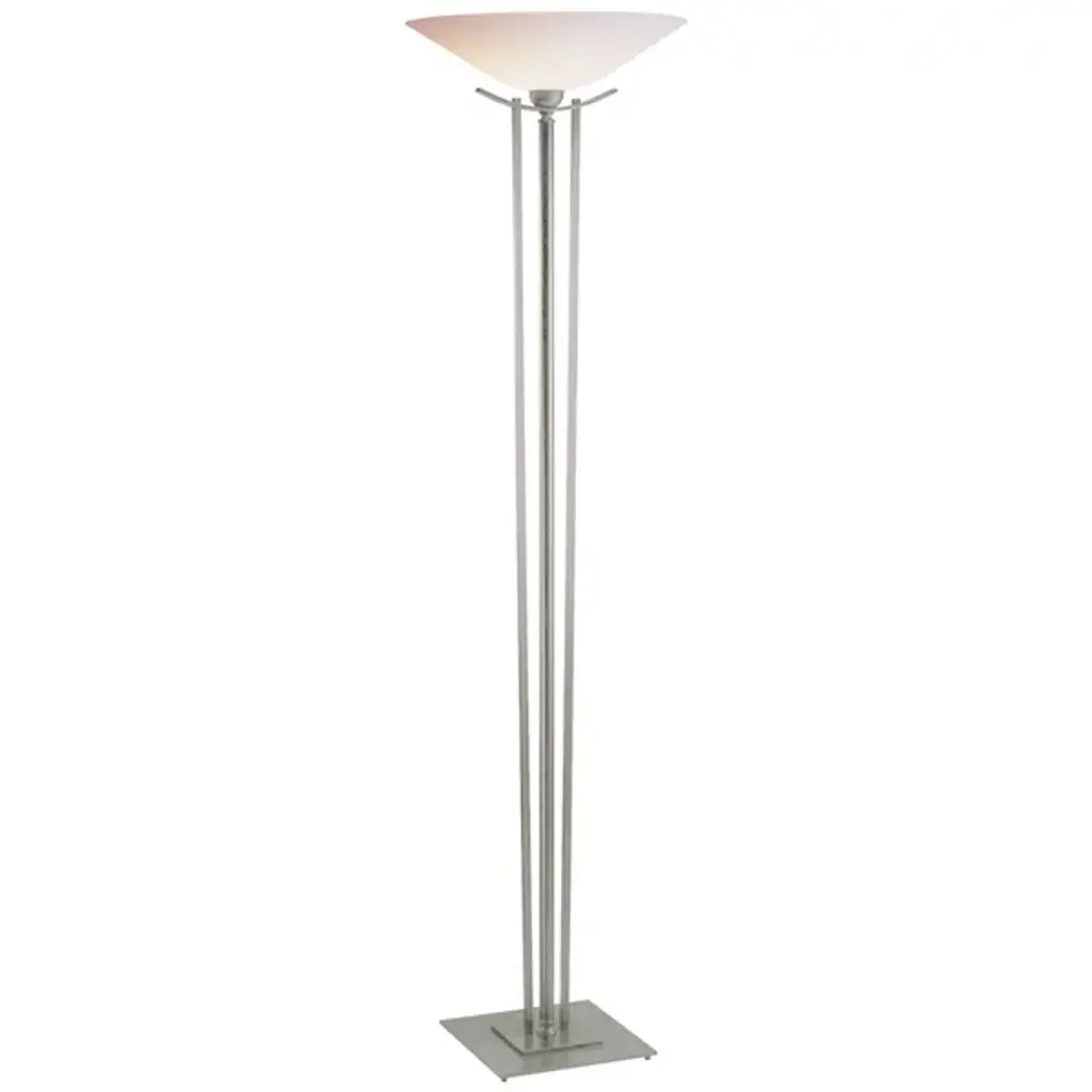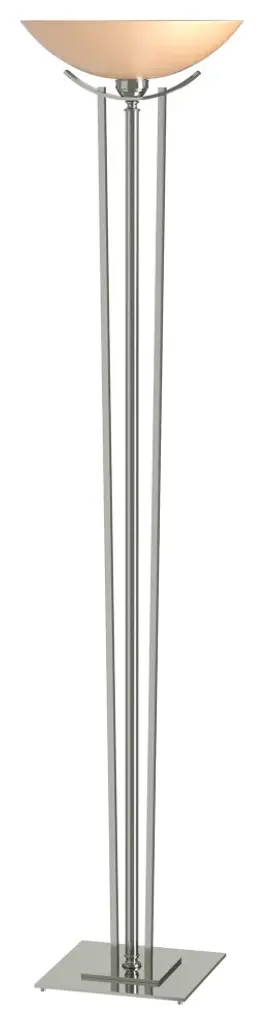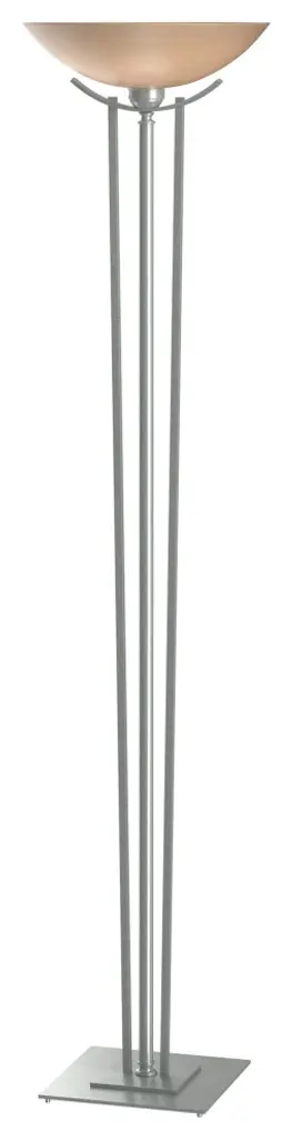 Taking a cue from the tall ornamental stands for candlesticks from long ago, our Torchiere rises to the height of elegance with two rods of steel escorting the steel tube up to the glass bowl.