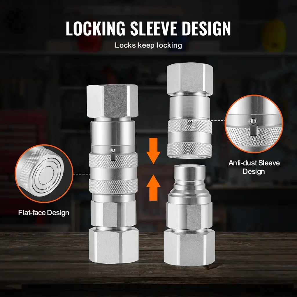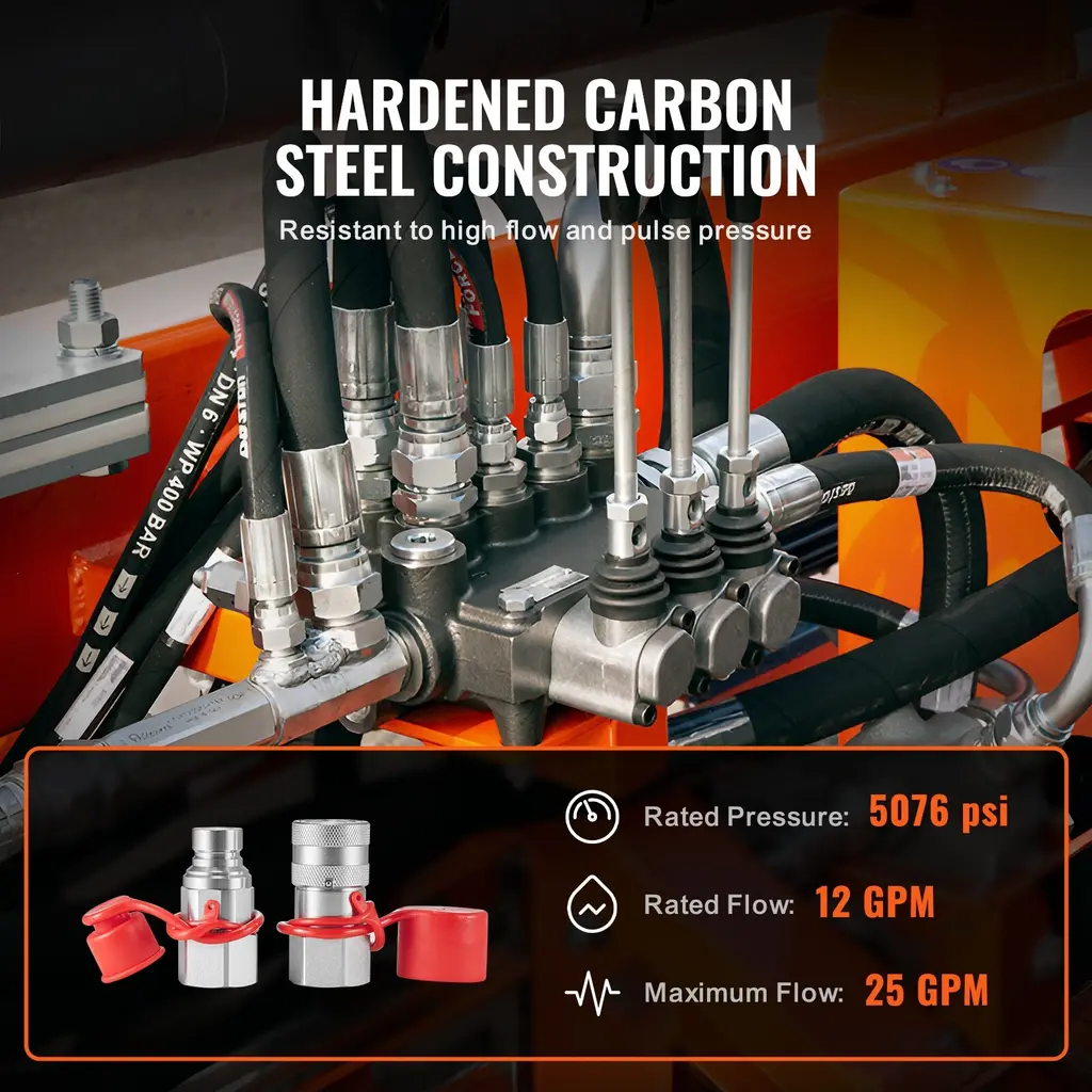 Standards Compliant: This hydraulic coupler features a 1/2" body size, with a 1/2" NPT / 3/4 SAE( 5000 PSI option) thread size for both the male and female couplers, adhering to ISO 5675 standards(for tapered design ) / ISO 16028 standards(for flat face design), making it ideal for connecting hydraulic lines. Sleeve Locking Design: The tapered hydraulic couplers / flat face hydraulic couplers features a sleeve locking design, allowing for easy connection with just a simple push. The tapered / flat-faced design of the coupler prevents leakage and also prevents dust from entering the hydraulic system during connection and disconnection. Hardened Steel Construction: The hydraulic quick connect couplers is constructed from hardened carbon steel, rated for pressures up to 4000 PSI / 5076 PSI / 5000 PSI and a high flow rate of 25 GPM, capable of withstanding high flow rates and pulse pressures, ensuring durability for years of continuous use. Seal Dust Caps: It comes with dust caps to prevent dirt from damaging the connection system, reducing the risk of failures, and keeping the skid steer hydraulic couplers clean when not in use. Internal dust seals also ensure that the sleeve locking system operates smoothly without interference. Non-slip Knurling: Heavy-duty knurled sleeves on the surface of the hydraulic fitting provide a non-slip grip. This valve design allows for minimal pressure drop and single-handed operation, and it can be interchanged with most types of skid steer loaders, such as Bobcat, John Deere, CAT, Case/New Holland, Kubota, etc. Package Content Dust Cap ×4 / Dust Cap ×2