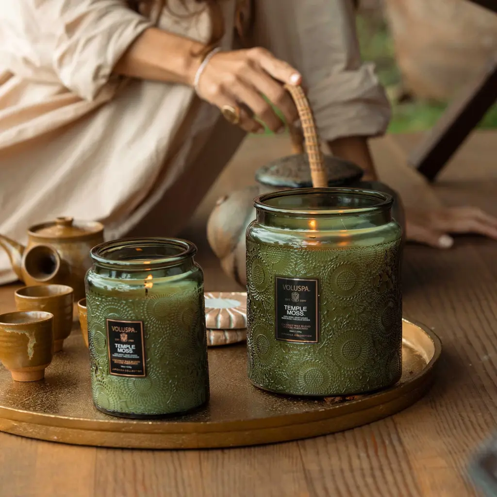 Seek solace in the forest with the Temple Moss Collection from Voluspa. Ground down in the healing notes of cool moss, dewy leaves, wet stones, and the warm sun. The Master Perfumer, Mother Nature, will guide you to tranquility. The fragrant candles features notes of Cool Moss, Dewy Leaves, River Rock, & Precious Woods.
