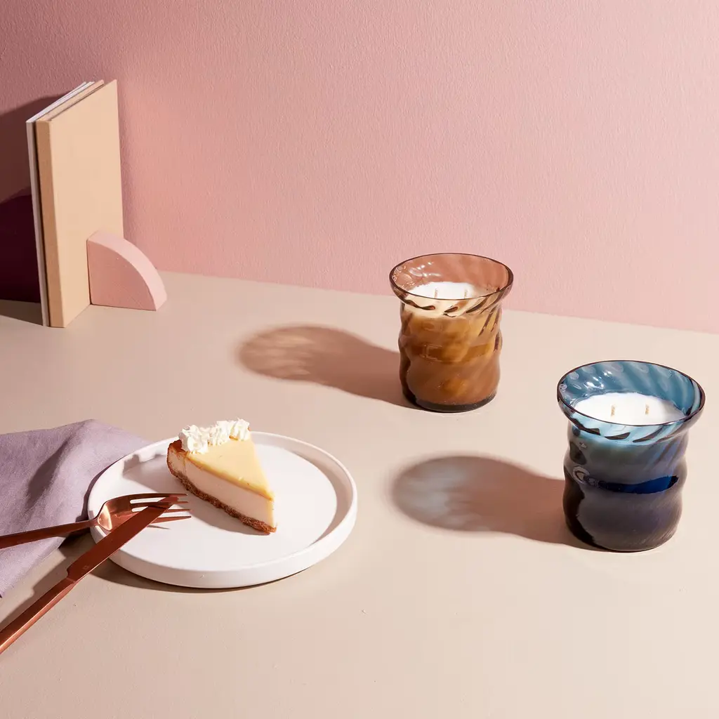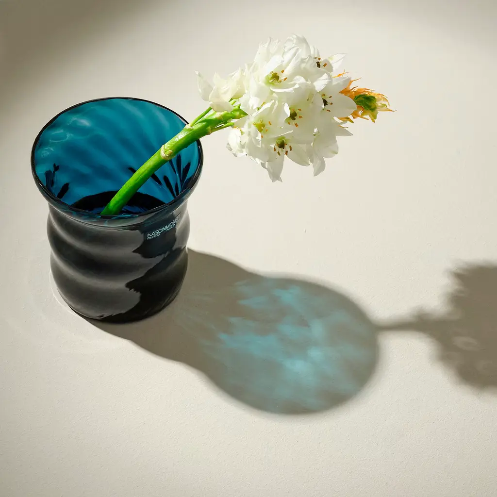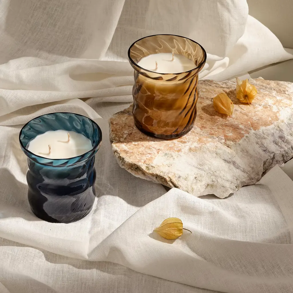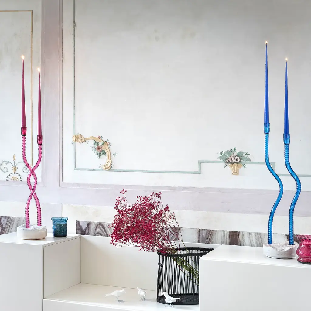 Designer -Irina Flore Mold-blowing design candle created with rigadin or grooved decorative motif on the surface in a timeless Venetian twist. This sinuous candle as elegant as a woman's body shape in a magnetic blue color is dedicated to Lucrezia di Siena, an Italian stage actress. Lucrezia, extremely emancipated highly educated in singing, declamation, music, and dance. She is known as the first female actor in Italy and Europe since antiquity, signing an acting contract by Commedia dell’Arte.