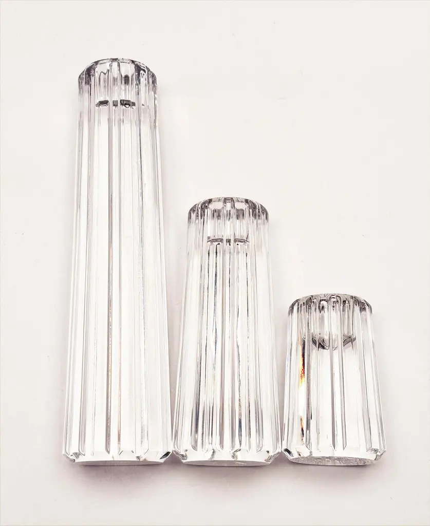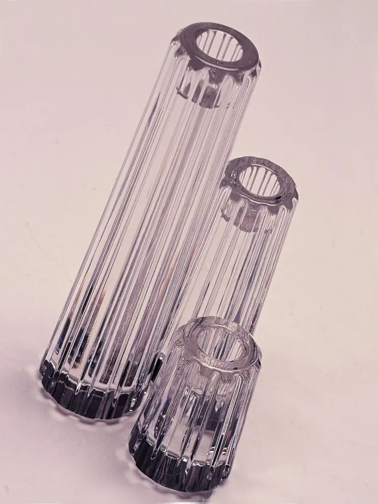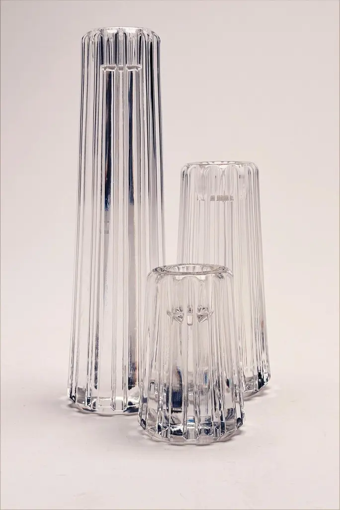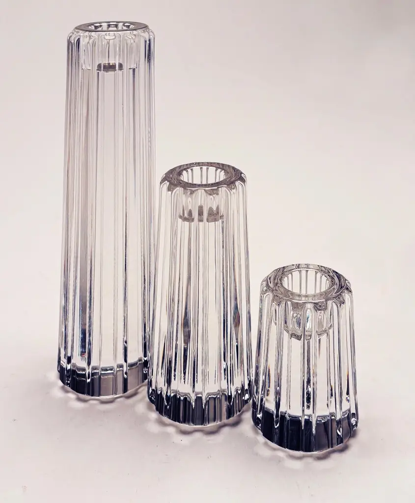 These three elegant Art Nouveau style crystal candle sticks were created by Tiffany & Co. in the late 20th century. Their sleek and simple design reflect the Tiffany brand in such a beautiful and fitting way. Their design sets these pieces up to be a great decorator choice for so many room decors. Used in a grouping on a mantel or a counter top in a bathroom, this trio is sure to bring form and function to the look.Dimensions:All three pieces have a 2” diameter base that tapers off to 1.63” diameter at the openings. The following are the height measurements for each one: small-2” diameter x 3.125”h, medium-2” diameter x 5.125”h and 2” x 8.125”h