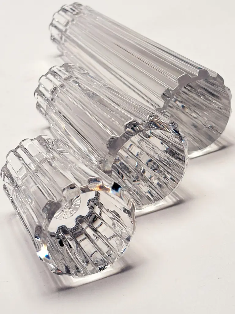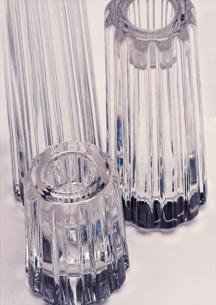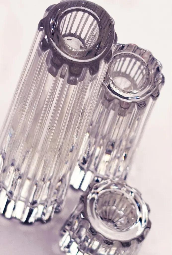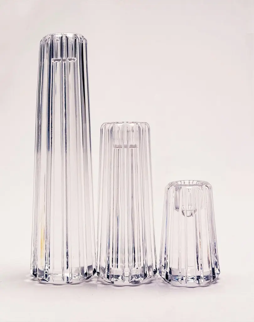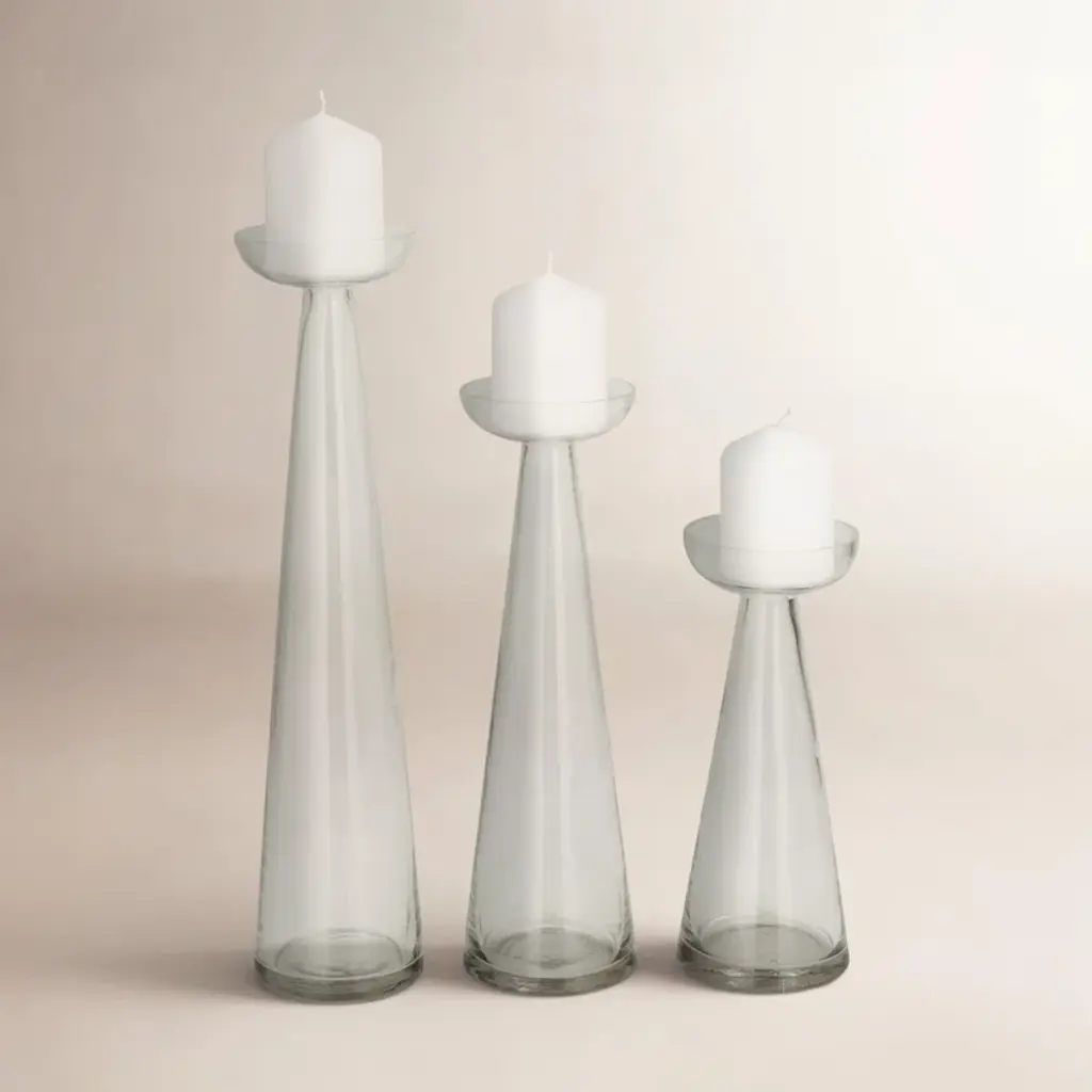 These three elegant Art Nouveau style crystal candle sticks were created by Tiffany & Co. in the late 20th century. Their sleek and simple design reflect the Tiffany brand in such a beautiful and fitting way. Their design sets these pieces up to be a great decorator choice for so many room decors. Used in a grouping on a mantel or a counter top in a bathroom, this trio is sure to bring form and function to the look.Dimensions:All three pieces have a 2” diameter base that tapers off to 1.63” diameter at the openings. The following are the height measurements for each one: small-2” diameter x 3.125”h, medium-2” diameter x 5.125”h and 2” x 8.125”h