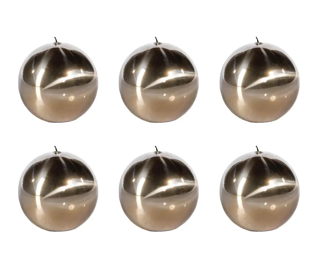 Accentuate your holiday home accessories with a contemporary Titanium Ball Candle. Gold in color with a finish top layer of metallic paint on a regular molded wax. Display and use on a mantel or tray.