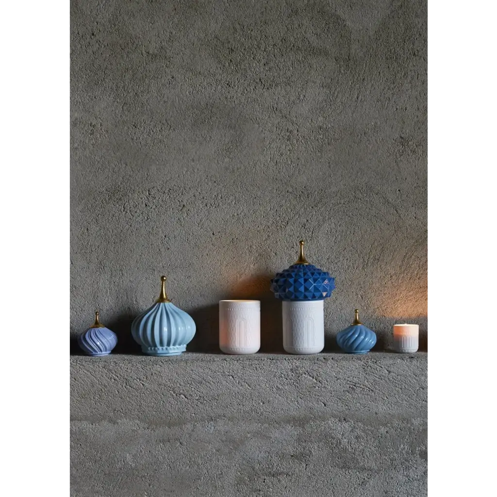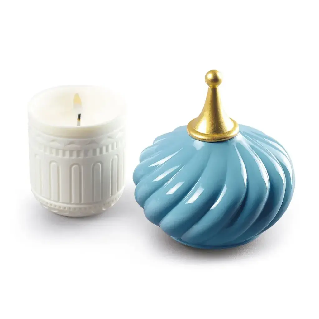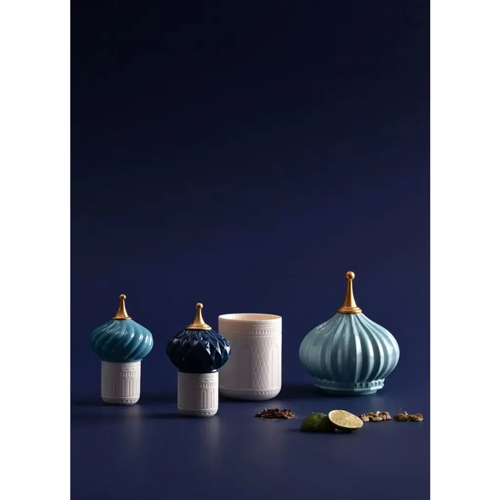 Inspired by the magical world of the tales of the Arabian Nights and its evocation of exoticism, fantasy and adventure. The candles in this collection delicately combine light and aroma to produce a dreamy atmosphere. Held in poetic containers of translucent porcelain, the luminous effect produced by the hand-engraved motifs on the surface transports us to a world of fairytales. The elaborate dome protecting the wax is embellished, hand painted and crowned by a point decorated with 22 carat gold lustre, applied by means of a complex artisanal technique. It is comprised of natural wax and 15% perfume, which is a particularly high percentage for candles of this category and equivalent to l'eau de parfum´ in the world of perfume. It is available in the fragrance ´Indomitable Spirit, an exotic aroma of bergamot, cardamom and musk created exclusively for Lladró. Content: 285 g/10.5 oz. Duration: 65 hours. Smoke-free wick. An iconic Spanish brand, Lladro is a world leader in the creation of porcelain art. Started by brothers Juan, Jose and Vicente Lladro in 1953, the ceramic figurines were initially inspired by the works of great European manufacturers like Meissen and Sevres. Over time, a unique style was forged, consisting of elongated lines, a revolutionary single-firing method, and soft pastel tones.