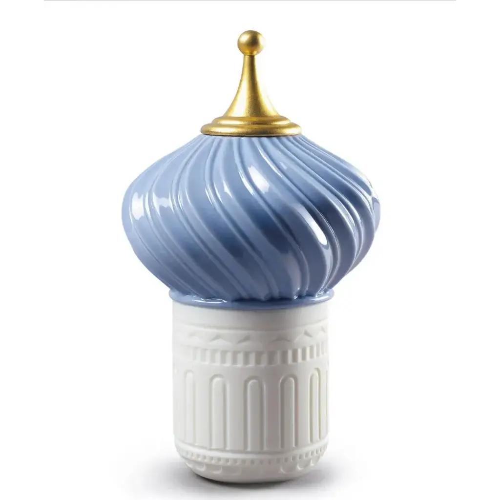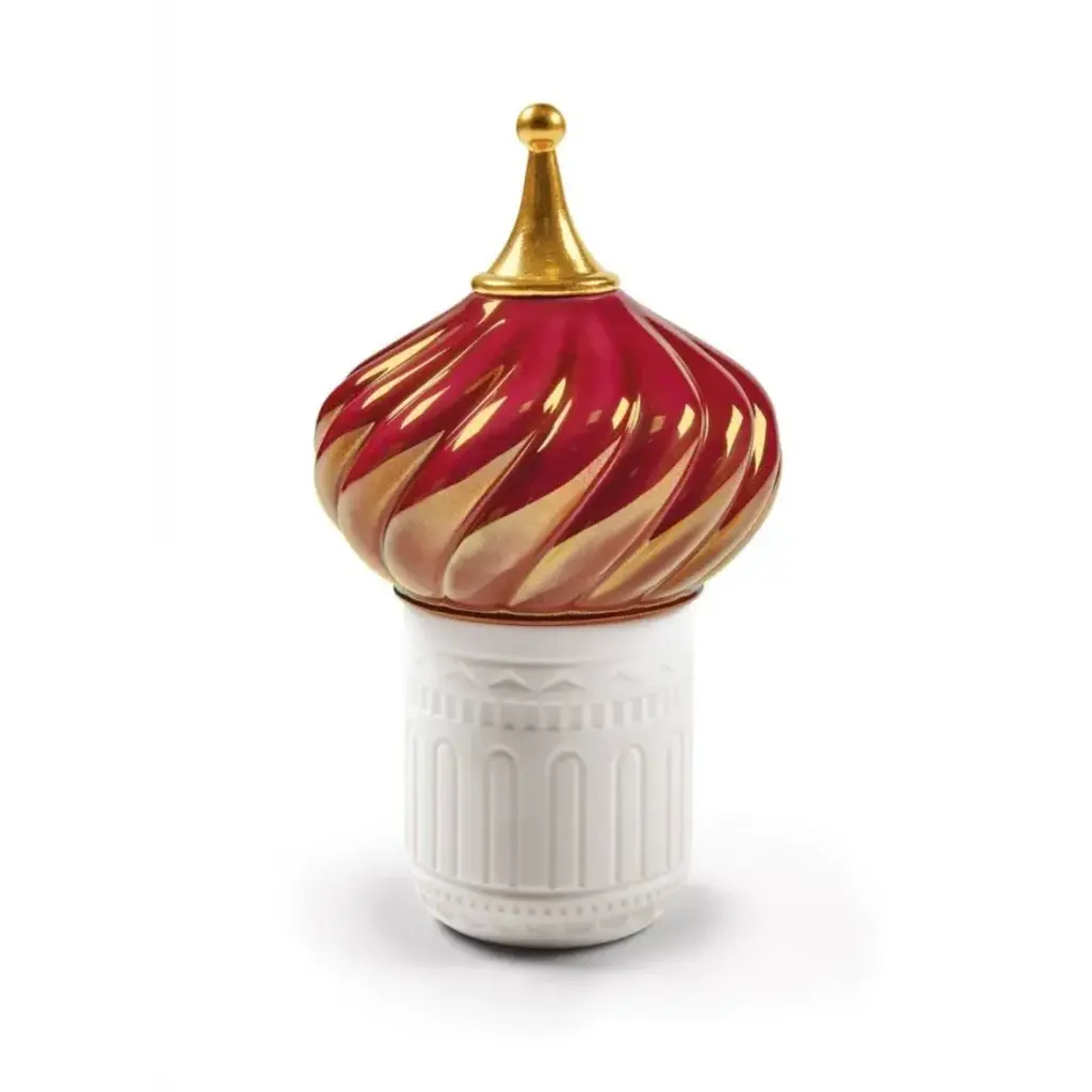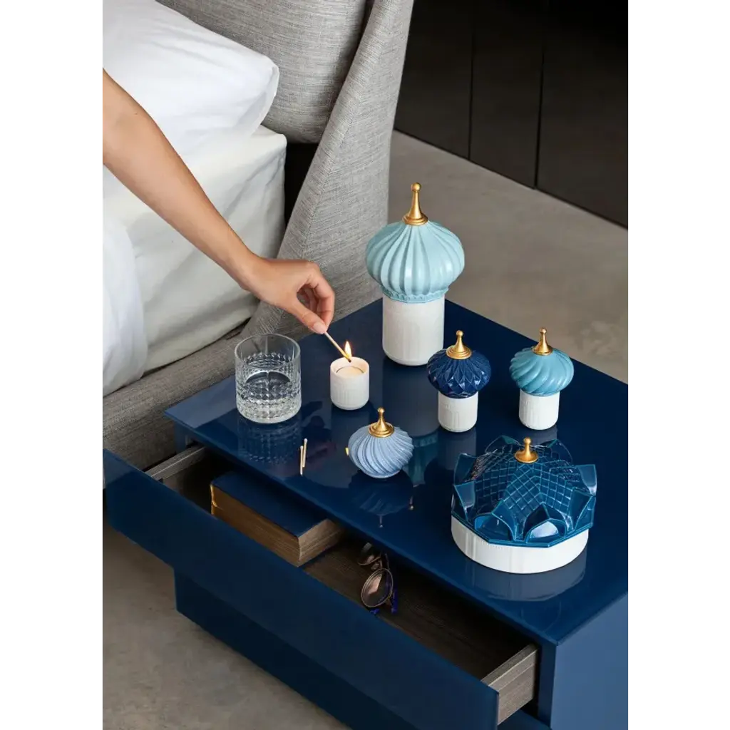 Inspired by the magical world of the tales of the Arabian Nights and its evocation of exoticism, fantasy and adventure. The candles in this collection delicately combine light and aroma to produce a dreamy atmosphere. Held in poetic containers of translucent porcelain, the luminous effect produced by the hand-engraved motifs on the surface transports us to a world of fairytales. The elaborate dome protecting the wax is embellished, hand painted and crowned by a point decorated with 22 carat gold lustre, applied by means of a complex artisanal technique. It is comprised of natural wax and 15% perfume, which is a particularly high percentage for candles of this category and equivalent to l'eau de parfum´ in the world of perfume. It is available in the fragrance ´Indomitable Spirit, an exotic aroma of bergamot, cardamom and musk created exclusively for Lladró. Content: 285 g/10.5 oz. Duration: 65 hours. Smoke-free wick. An iconic Spanish brand, Lladro is a world leader in the creation of porcelain art. Started by brothers Juan, Jose and Vicente Lladro in 1953, the ceramic figurines were initially inspired by the works of great European manufacturers like Meissen and Sevres. Over time, a unique style was forged, consisting of elongated lines, a revolutionary single-firing method, and soft pastel tones.