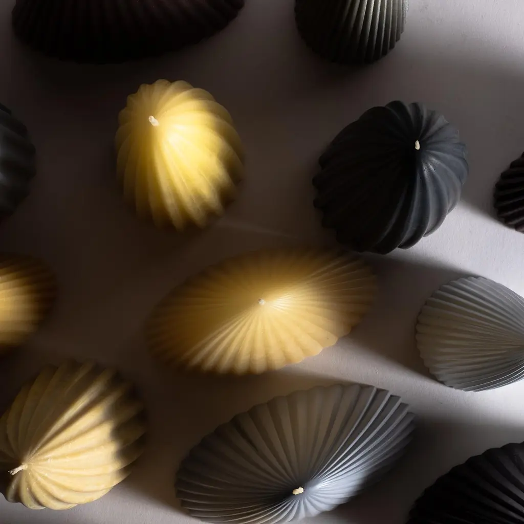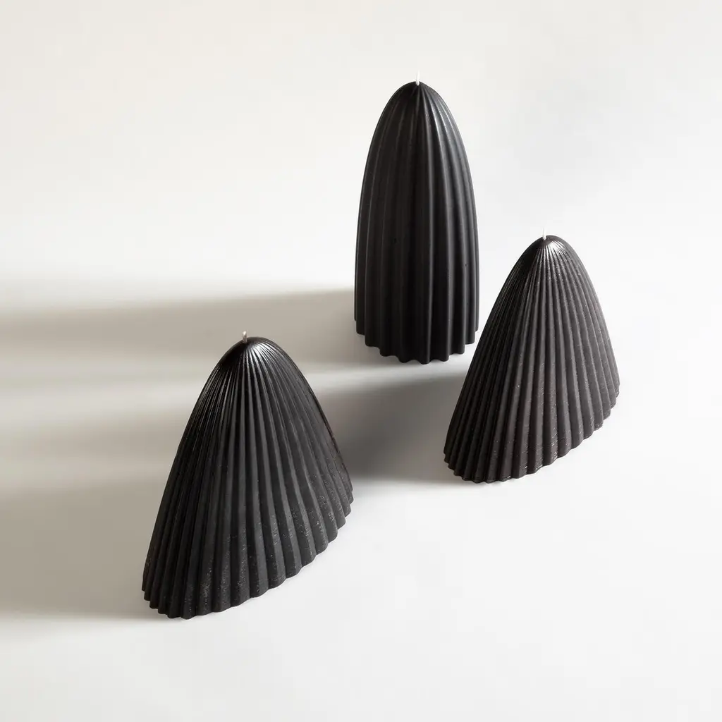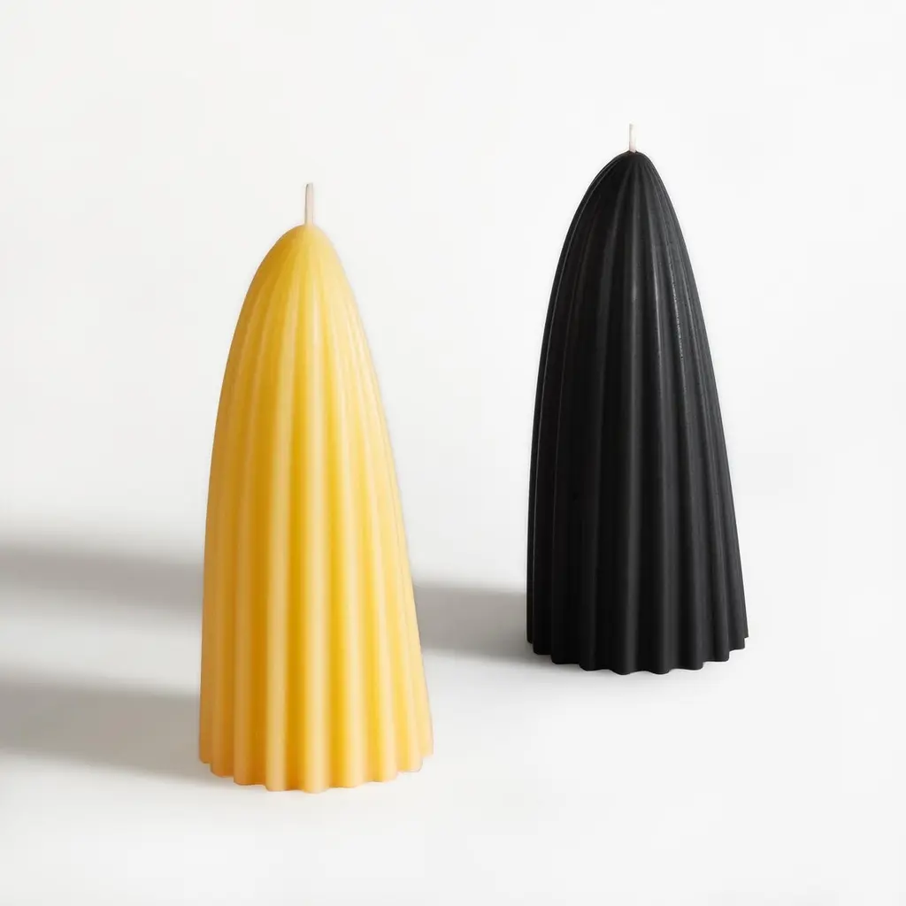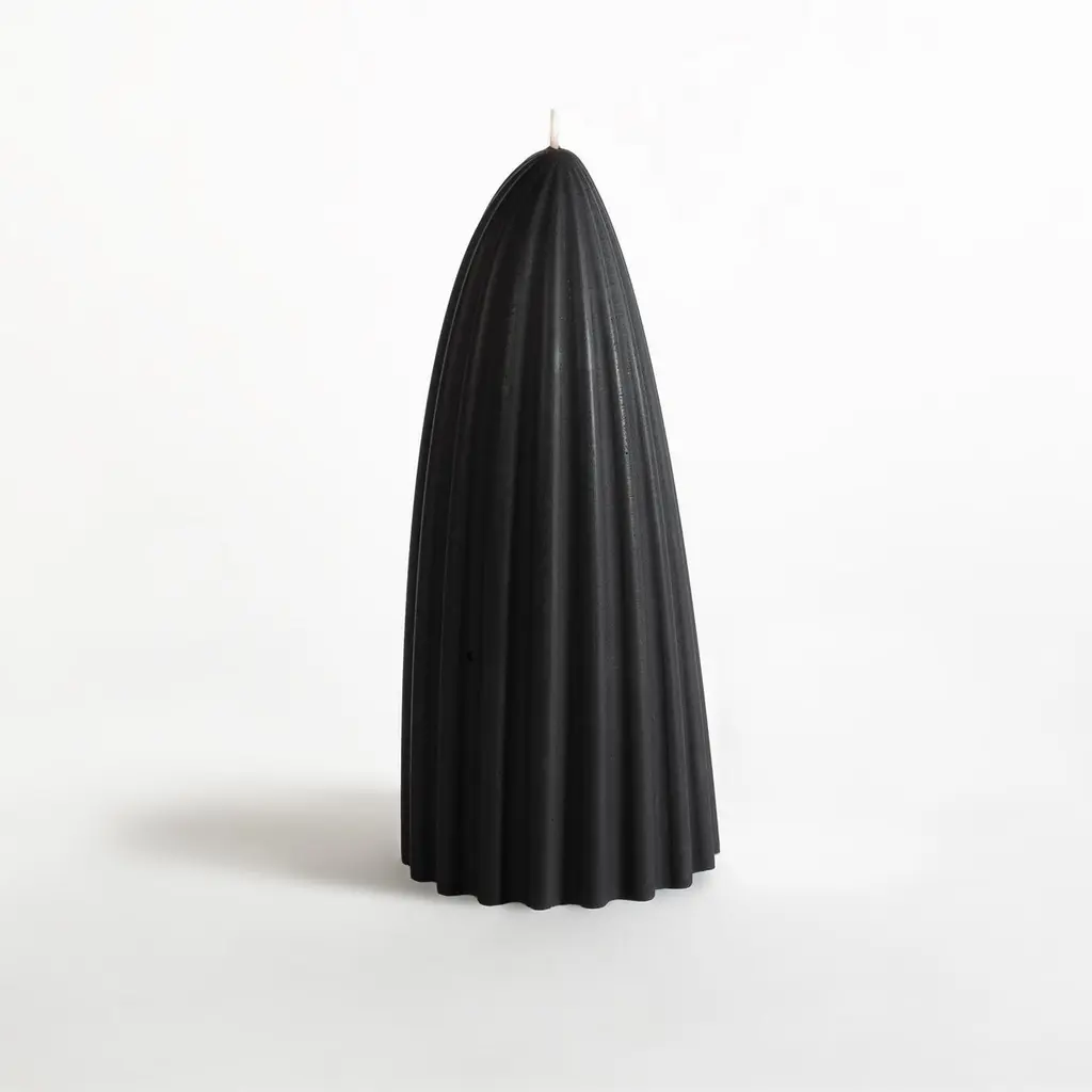 100% beeswax, organic hemp wick and coloring, unscented.The tusk candle takes its inspiration from natural motifs: Ivory, tusks, canines, teeth and other fangs. Ridges play with wax, channeling it, also slowing down the burn.It is one of these artifacts in between, animal and vegetal, inanimate and perhaps alive.~ Measures: 3.5" x 3.5" ~ 8" tall~ 1.5 lbsEach candle is handmade in Oakland, CA. Tusk candle is available as a set of the small and medium size in both natural and black.