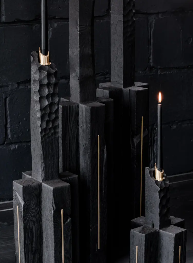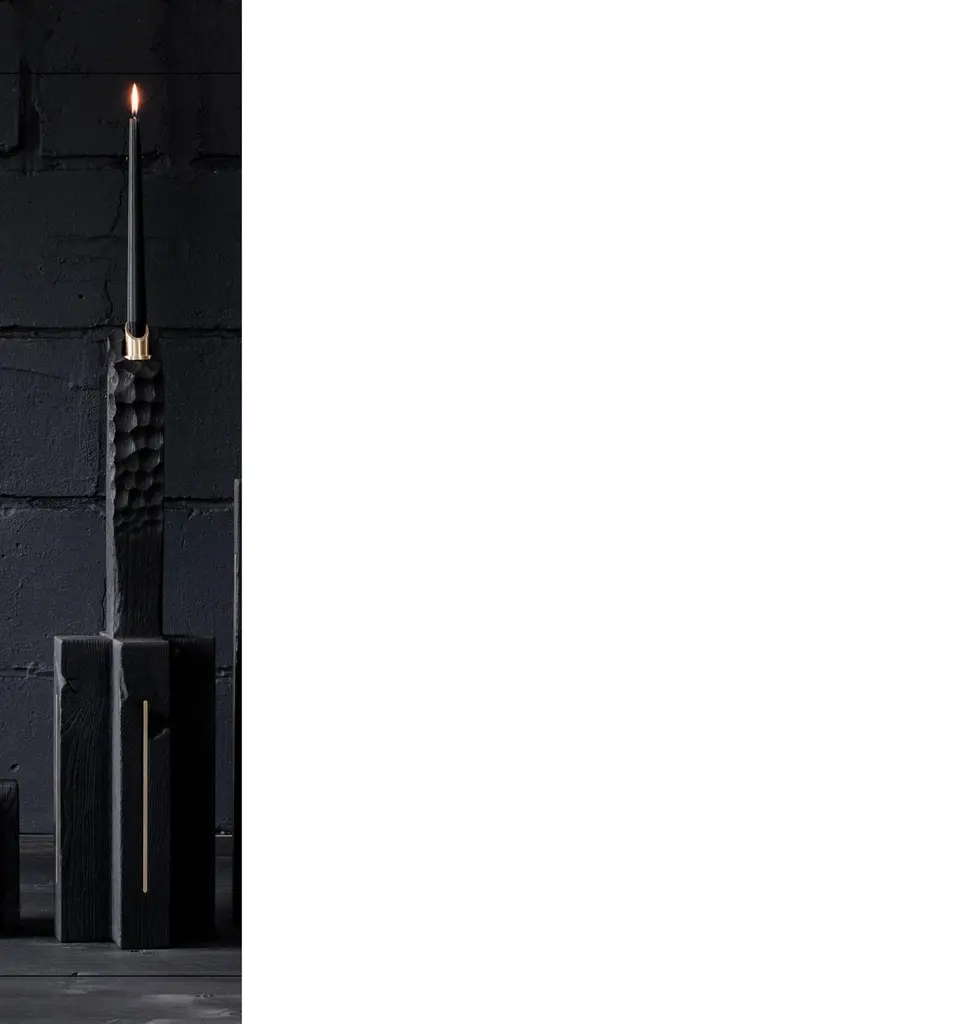 Unique Roots Candle Medium by Jeremy DescampsUnique pieceDimensions: 20 x 20 x 80 cmMaterials: Candles in solid oak from the country burned in flam, inserts in brass, support of candles in brass.Even in the darkest places, where everything is black, a small flame is enough to illuminate.These candlesticks symbolize the hope that can be found in all places, in all circumstances. They are the light that we bring to magnify the black, give it its relief, its nuances, its texture.Each flame represents the light which sleeps or which burns in you.The wooden foot is like roots coming out of the earth to draw the essential energy for life.Description:Candles in solid oak from the country burned in flam, inserts in brass, support of candles in brass.Jeremy Descamps Born in Namur, July 7, 1987 Always attracted to manual trades, he went on to study as a lathe miller and made it his profession for more than ten years. It was in 2016 that he used his technical skills and his sensitivity to make his first creations, which will remain in the private sphere. It was the interest that these creations aroused in his entourage that prompted him to take the plunge and embark on the LFN adventure. He therefore embarked on the creation of tailor-made furniture for private and professional alike. This has enabled him to have nice collaborations such as the one with the Hors Champs restaurant. He also creates an annual collection, ORIGIN, made up of a range of home accessories, produced in very small series. Today LFN is evolving.Custom-made creations give way to total and unconstrained creation in the world of fine art furniture. He decides to present his creations made of wood only under the "Shu sugi ban" technique to mark his identity, his DNA, his black country in deep black (= Charleroi)He learns the previous gestures to cut and shape stone, a material he is particularly fond of. Supported by the benevolence of a former stonemason well known in Belgian quarries, it is the energy of the past that resurfaces in his creationsBrass makes its entry, as well as copper.Jeremy is an artist whose main concern is to share, provide emotions, give meaning to objects, sublimate shades of black, textures.He meets people, in particular that of Caroline NOTTE, architect whose presentations are no longer to be made.From this meeting was born a collaboration since she offered to exhibit two creations in his famous house designed by Louis Herman De Koninck.A great introduction to the world of fine art furniture, as well as the various requests from the famous VILLAS magazine to appear in their issues.