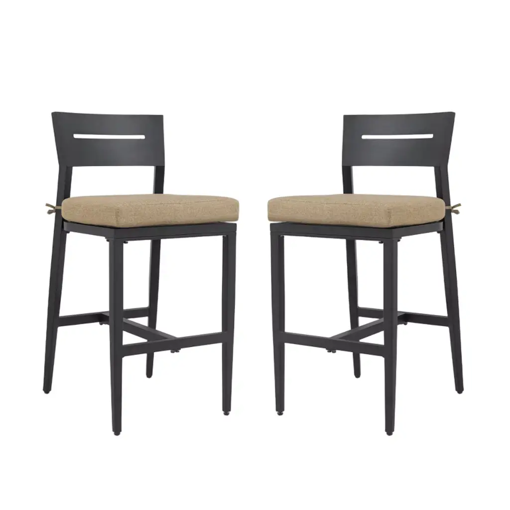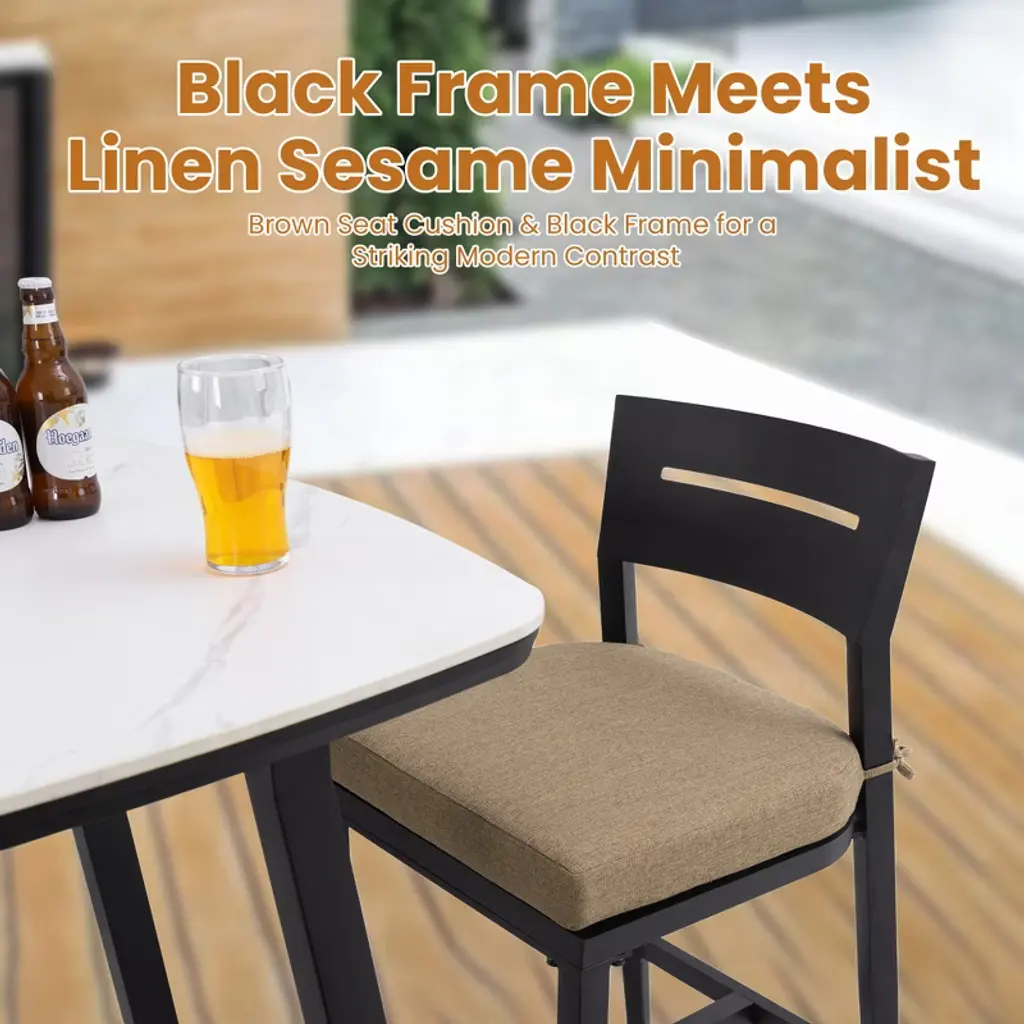 Upgrade your outdoor bar seating with this modern aluminum bar stool, featuring a heavy-duty Ember Black powder-coated frame that is rust-resistant and built to last. The ergonomic curved backrest ensures superior comfort, while the tapered leg design enhances both stability and style. A built-in footrest provides added support for a more relaxed sitting experience. The Sunbrella Linen Sesame cushion is fade-resistant, stain-resistant, and easy to maintain, with a removable high-density foam seat for lasting comfort. Adjustable scratch-resistant foot pads protect floors and adapt to uneven surfaces. Perfect for patios, poolside bars, balconies, and kitchen islands, this sleek bar stool adds both elegance and functionality to any space.