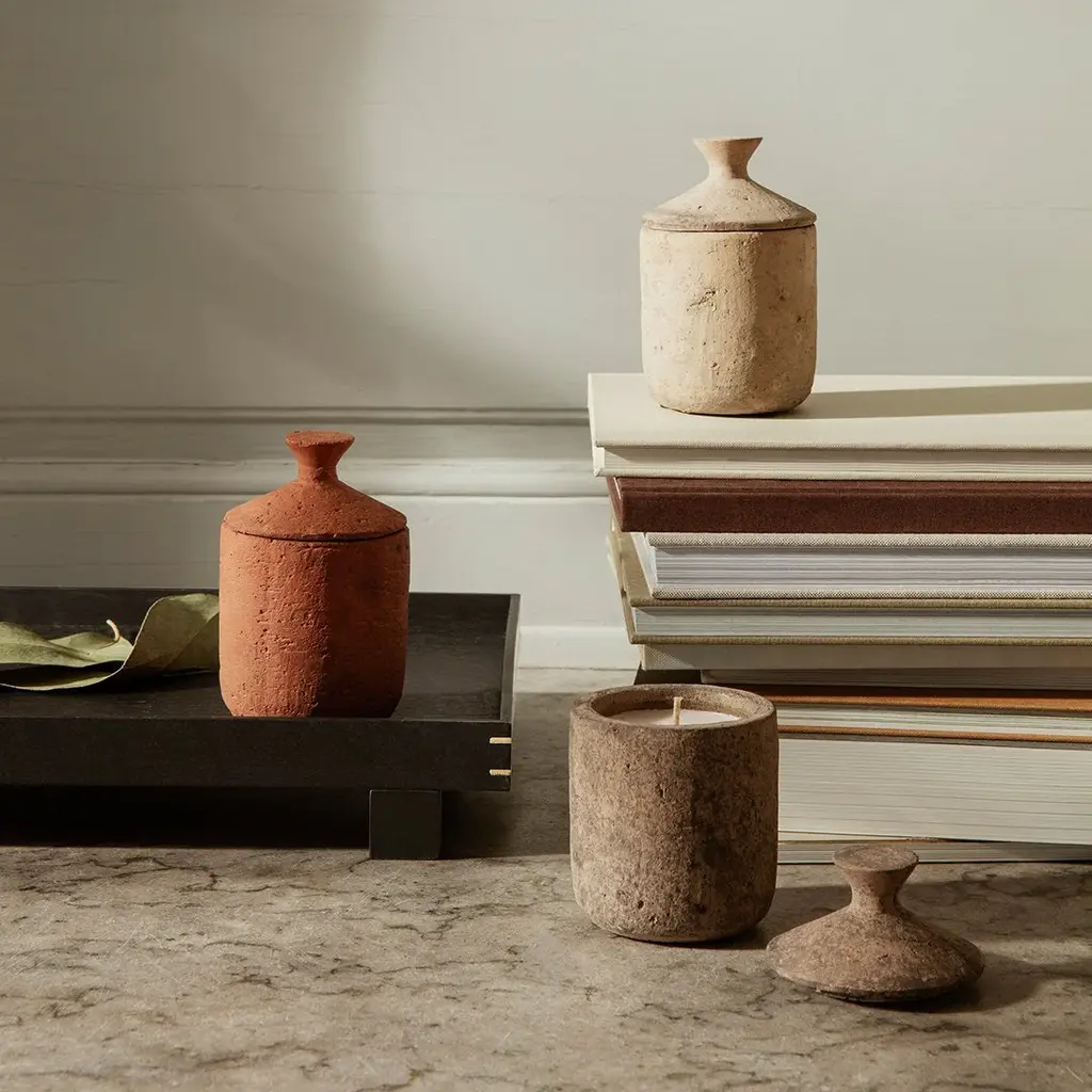 Reminiscent of treasures from the past, the Ura Scented Candle has a unique, raw surface owing to the process of hand pressing the terracotta. Completed with a matching terracotta lid, the scented candle has an earthy expression and invite to moments of relaxation and reflection. Choose your favourite scent to complement the sanctuary that you call home.