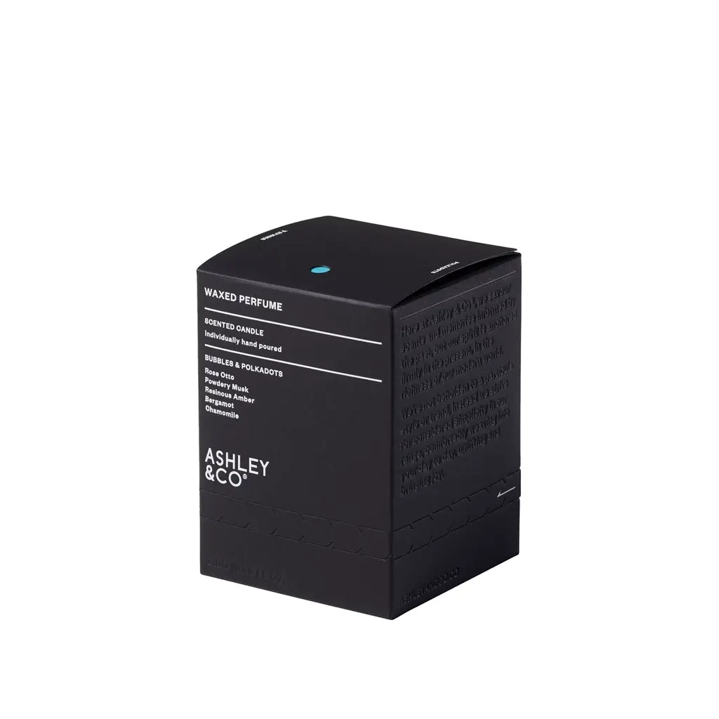 Waxed Perfume is a candle! Crafted to perfection, individually triple poured by hand in New Zealand using 100% natural biodegradable wax and an unbleached cotton wick.Bubbles & Polkadots | Scent ProfileA blend of Rich Florals and Rose Otto blend harmoniously with the powdery base notes of Musk and Resinous Amber.Rose OttoPowdery MuskResinous AmberBergamotCamomileEnjoy a burn time of up to 50 hours.Repurpose the hand-blown glass vessel after use.