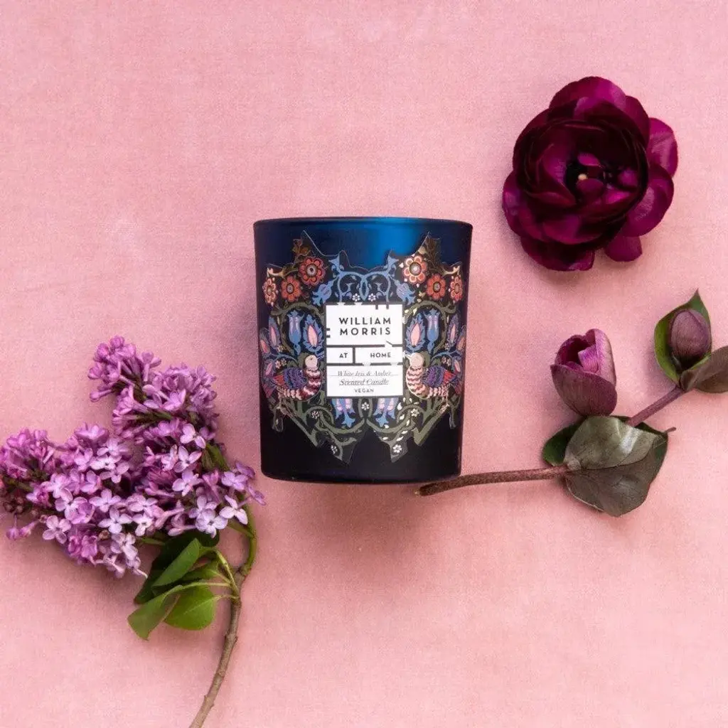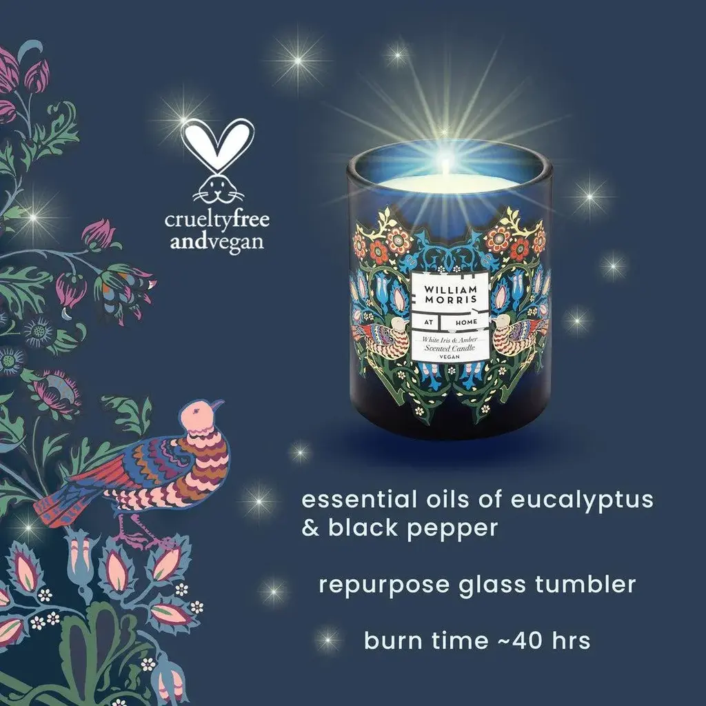 Bring a tranquil mood into your home with this exquisite White Iris & Amber scented candle, infused with warm and soothing spice and amber notes. The essence of calm, to create a relaxing mood at home. Infused with warm scents of White Iris & Amber with eucalyptus and black pepper essential oils balanced with notes of cardamom, patchouli and sandalwood. Crafted to inspire a feeling of tranquillity. The burn time of this candle is approximately 40 hours. The blue glass candle tumbler, decorated with the Dove and Rose design, glows like a jewel when lit and is ideal to reuse as a beauty caddy, desk tidy or posy vase. Did you know? William Morris was a prolific designer of beautiful, jewel-like stained glass windows in churches across England. Cruelty free and vegan friendly. Includes: 1 x Scented Candle 180g Ingredients: William Morris At Home White Iris & Amber Candle Composition: Wax, Parfum (Fragrance)