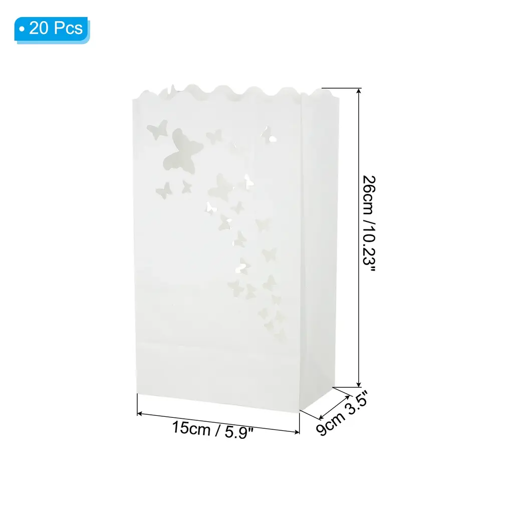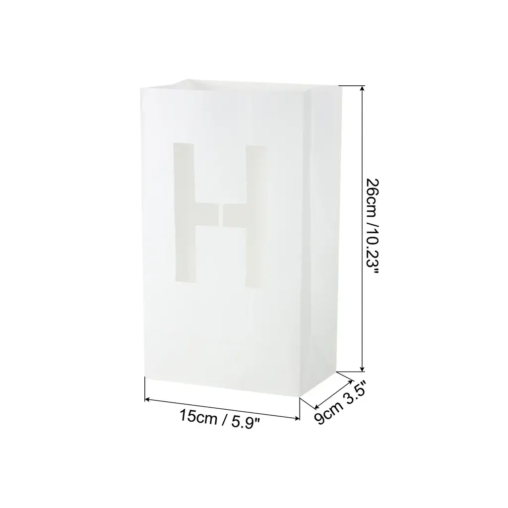 What is this?This product is made from fire retardant paper, you can use votive candles, tea lights or led lights to make elegant lanterns. These luminary bags can provide perfect mood lighting for your wedding, birthday, Christmas party, holiday party, anniversary and more.What will I get?Color: WhiteDesign: HeartMaterial: Flame retardant paperSize: 15*9*26mmPackage Content: 10 Pcs Luminary BagAre there any advantages of the product?This product is made of flame-retardant paper and is paired with carefully designed patterns. Whether you put candles or LED lights in the bag, it can provide you with a creative use experience and add a warm atmosphere to your life.This paper luminaries bags are suitable for a wide range of occasions, both indoors and outdoors. You can decorate it in your room for Christmas parties, weddings, birthdays, anniversaries and other activities, or use it for outdoor beach, garden yard, barbecue dinner and other activities.How to use it?After opening the bag, put candles, tea lights, LED lights and other light sources into the bag, adjust the light source to the appropriate angle, and then you can enjoy the fun it brings you.What should I notice?Please note that this product are paper luminary bags only and does not include light sources such as candles, LED lights, etc. Since the bags are relatively light, you can place some stones or sand at the bottom of each bag when using it to prevent them from being blown away by the wind.