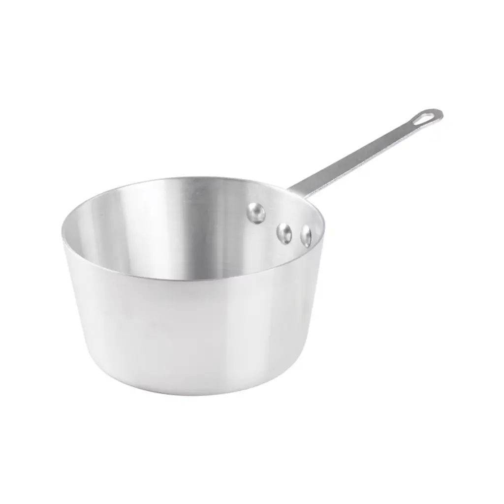 Make all your favorite sauces: hollandaise, becìhamel, caramel. This tapered aluminum sauce pan is just as useful when putting up soup, cooking rice, vegetables, and more. The tapered sauce pans have sloped sides and rounded corners for easy stirring and cleaning. The aluminum encapsulated base allows even heat distribution, making this aluminum tapered sauce pan an indispensable, versatile tool in every kitchen.