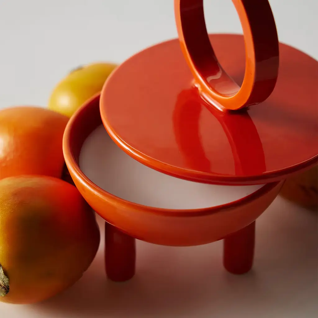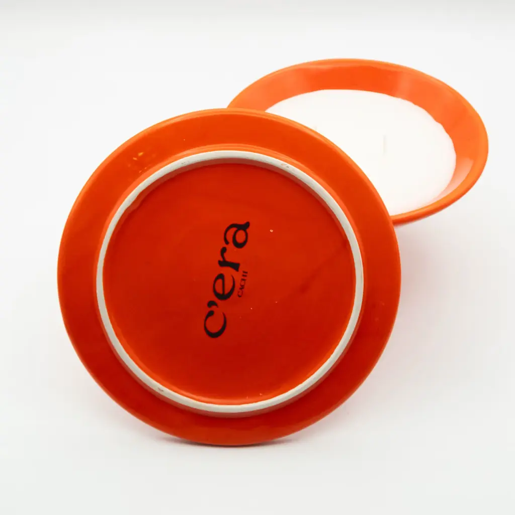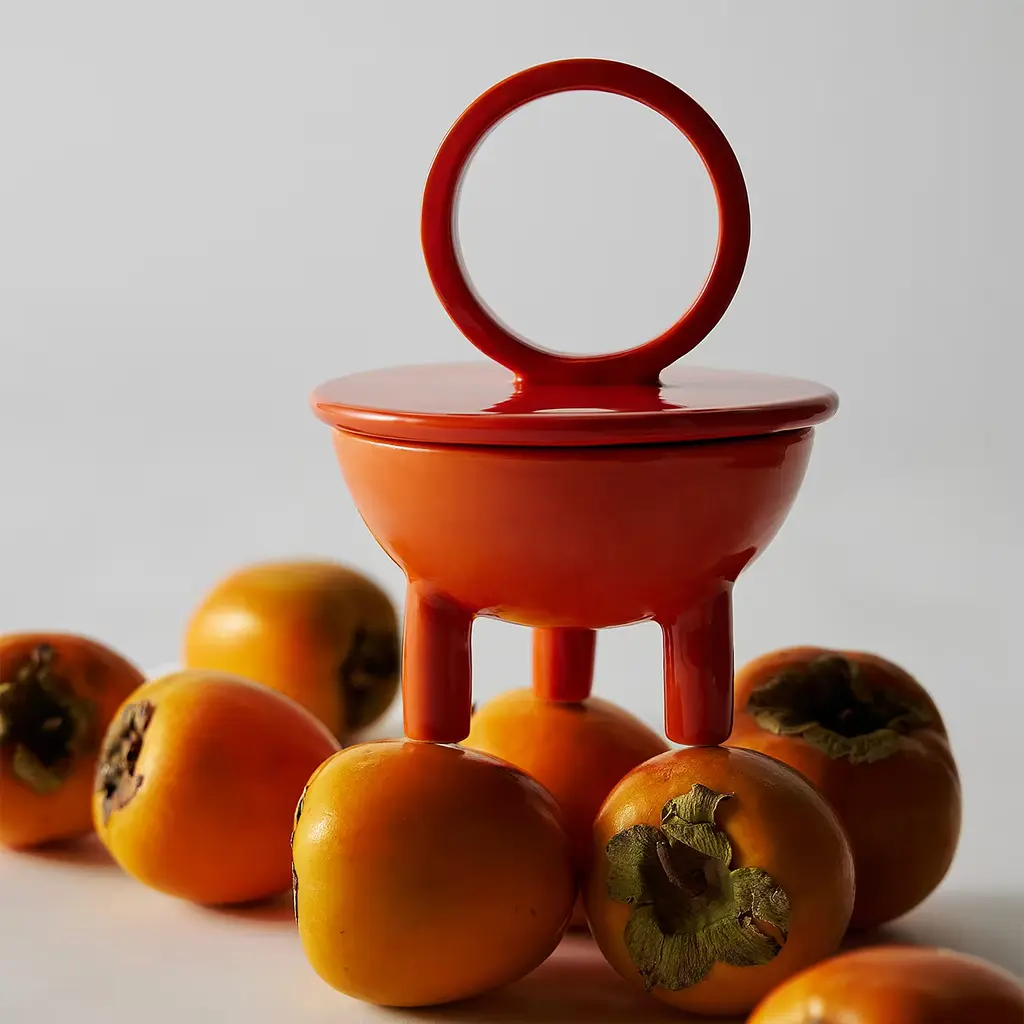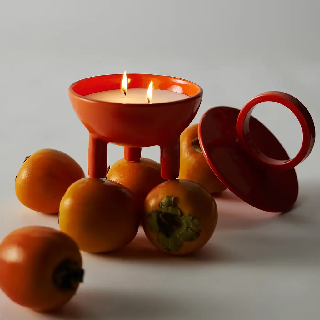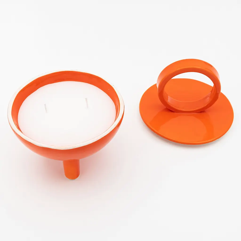 Bring elegance to your decor with this sublime decorative candle, crafted to enhance decors with timeless beauty. The ceramic body, with its bowl-shaped base and bold circular handle, is entirely handmade and features a bright orange glaze that echoes the candle's ripe persimmon fragrance with floral notes of ginger, eucalyptus, and white flower. 100% sustainably Made in Italy.